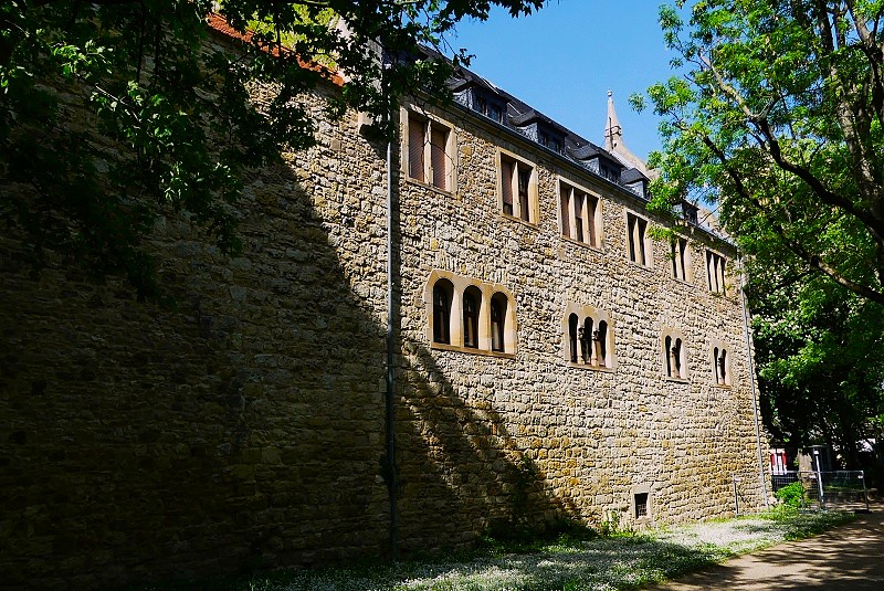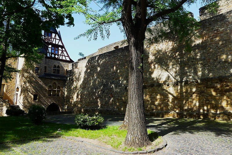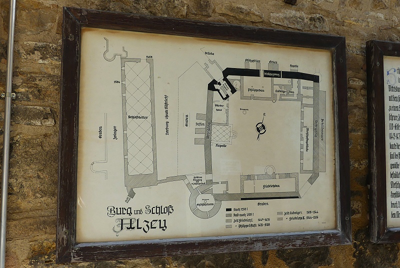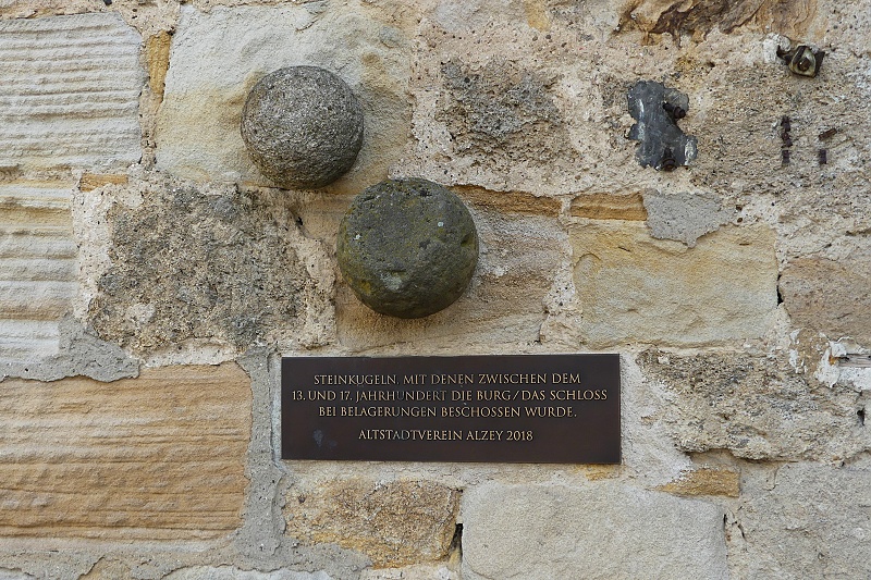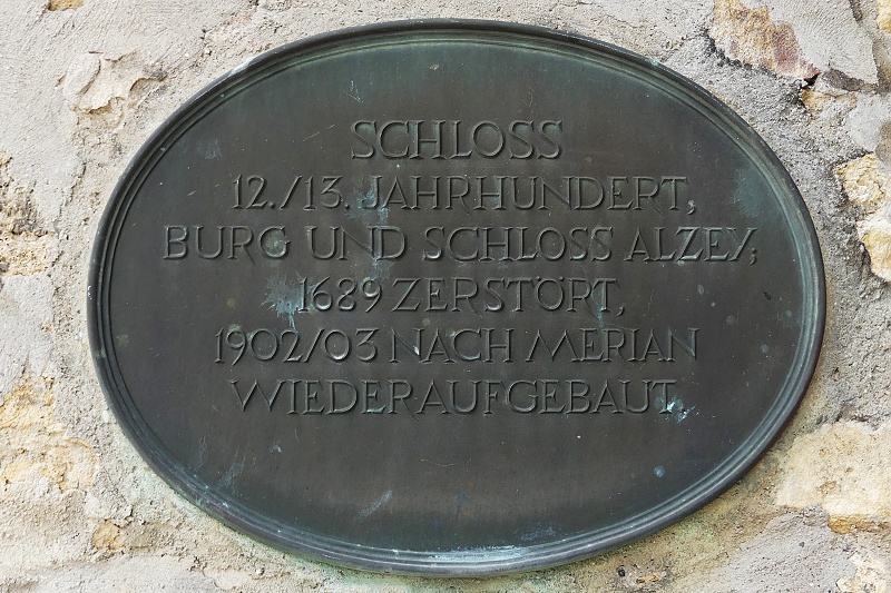 02.05.2025: Das Alzeyer Schloss ist vermutlich aus einer staufischen Reichsburg hervorgegangen und wurde im 16. Jahrhundert zum Schloss ausgebaut. Es wurde 1689 im Pfälzischen Erbfolgekrieg zerstört und erst zu Beginn des 20. Jahrhunderts vom Grossherzogtum Hessen wieder aufgebaut. Das Schloss war vor der Zerstörung Sitz der Oberamtsverwaltung und beherbergt heute das Amtsgericht von Alzey sowie das Mädcheninternat des Alzeyer Aufbaugymnasiums. Es handelt sich um eine rechteckige Burganlage am östlichen Rand des alten Stadtkerns, die als Ruine um 1905 wieder aufgebaut wurde. Hierbei diente weitgehend historisches Bildmaterial zur Vorlage. Nach Osten, zum ehemals freien Gelände hin, besitzt sie eine mächtige Schildmauer, westlich, zur Stadt hin, grenzt sie mit einer Vorburg an die Stadtmauer. Durch sie führen zwei Tore in die Vorburg. Nach Süden hin befindet sich der sogenannte Friedrichsbau, heute als Internat genutzt, nach Norden das imposante Ensemble des Philipps- und Ludwigsbaues, die als Amtsgericht und Justizgebäude dienen. In der Südwestecke sitzt ein weithin sichtbarer, dicker Rundturm, der unter Kurfürst Friedrich I. als Geschützturm erbaut wurde. In der Nordwestecke steht ein Torturm, durch welchen von der Vorburg her der einzige Eingang in die Burg führte. Um die innere Burg läuft eine Ringmauer mit Teilen eines Wehrganges der früher komplett um die Anlage führte.