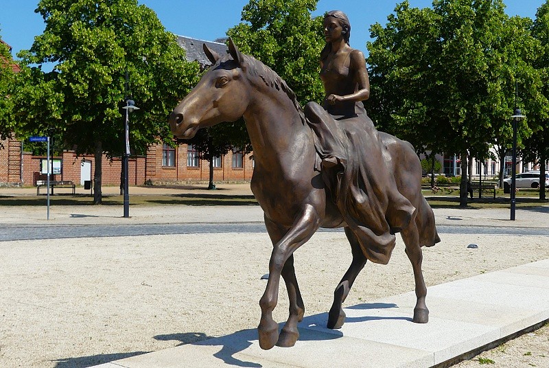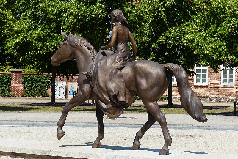 21.06.2025: Die Statue wurde im Jahr 2003 von den Bildhauern Andreas Krämmer und Holger Lassen geschaffen und erinnert an Alexandrine von Preussen (1803–1892), die durch Heirat Grossherzogin von Mecklenburg-Schwerin wurde. Seither prägt die kunstvolle Bronzefigur auf einem Pferd reitend das Bild des Alexandrinenplatzes: