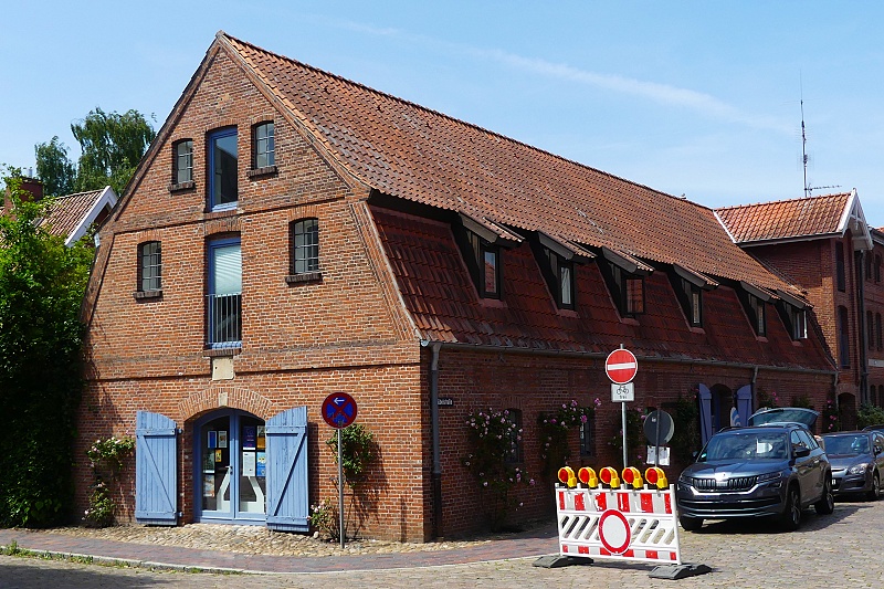 13.06.2025: Der mächtige backsteingemauerte Hafenspeicher von 1827 direkt am Binnenhafen hat eine quadratische Grundfläche von 14 x 14 m. Aufzugsvorrichtungen erlaubten die Beförderung der Waren von der Wasser- wie auch von der Landseite. Von 1894 bis 1976 nutzte die Glückstädter Heringsfischerei das Bauwerk als Salzspeicher: