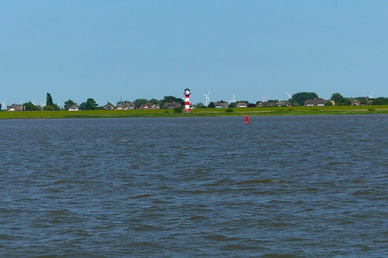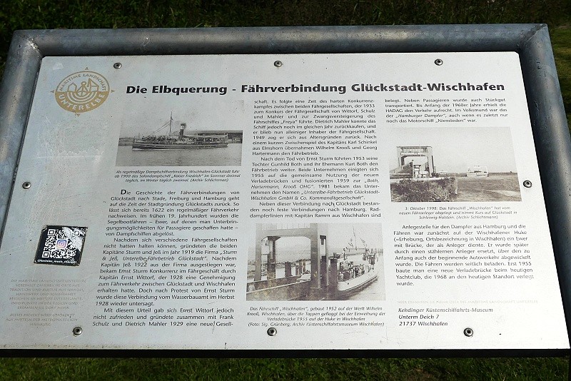 Überfahrt mit der Fähre nach Wischhafen mit dortiger Infotafel Elbquerung und Aussichtsplattform: