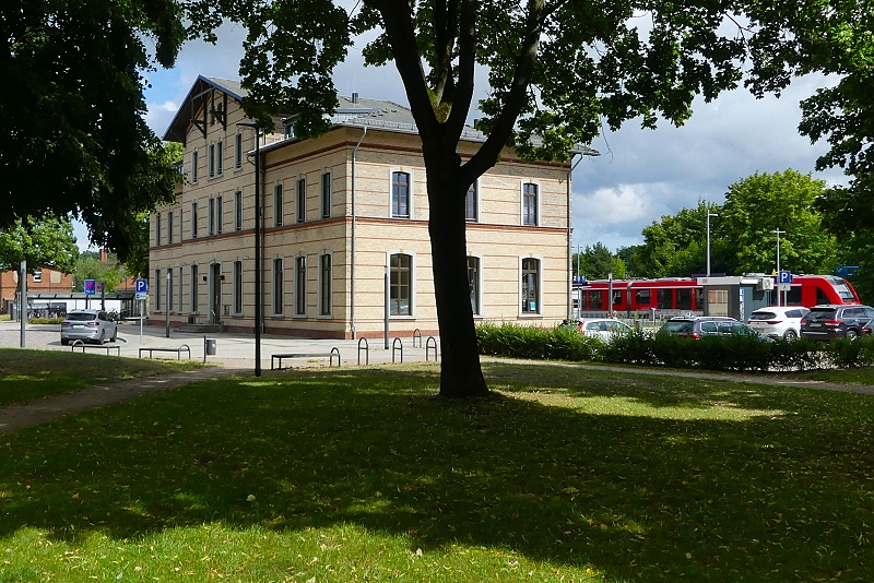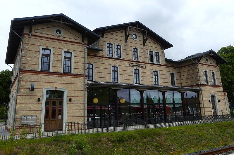 09.07.2025: Der Bahnhof Grevesmühlen liegt an der Bahnstrecke Lübeck-Bad Kleinen und wird von der Regional-Express-Linie RE 4 (Lübeck-Szczecin) im Stundentakt bedient. Die Bahnstrecke Grevesmühlen-Klütz begann in Grevesmühlen, der Personenverkehr wurde 1995 eingestellt. 1997 bis 2005 gab es auf der Strecke touristischen Verkehr mit historischen Lokomotiven und Triebwagen. Nach einem Umbau und der Sanierung strahlt das Bahnhofsempfangsgebäude aus dem Jahr 1871 heute in neuem Glanz. Die beeindruckende Ziegelfassade mit Terrakottasteinen, Wandbemalungen, Holzbalkendecken und historische Fliesen wurden erhalten und erinnern an die Entstehungszeit des Gebäudes, welches heute gleichzeitig vielfältigen Nutzern modernsten Komfort bietet: