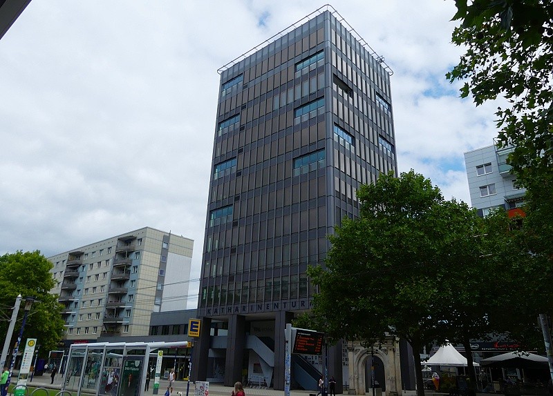 26.07.2025: Der Katharinenturm ist der neue Leuchtturm im Herzen Magdeburgs. Hier stand die in ihrem Ursprung mehr als 700 Jahre alte Katharinenkirche. Kriegsbeschädigt und zu DDR-Zeiten abgerissen erbaute man an gleicher Stelle das Haus der Lehrer. Lange Zeit leerstehend wurde es 2012/2013 aufwendig modernisiert und umgebaut. Die insgesamt 5.000 Quadratmeter Fläche gliedern sich im Erdgeschoss in eine vorgezogene Ladenzeile und einen Nahversorger sowie in den Obergeschossen in Büroflächen und der Konferenzetage mit Panoramablick über die Stadt. Für ein optisches Highlight sorgen ca. 16.000 LED-Leuchten, die die Fassade in den Abendstunden erstrahlen lassen: