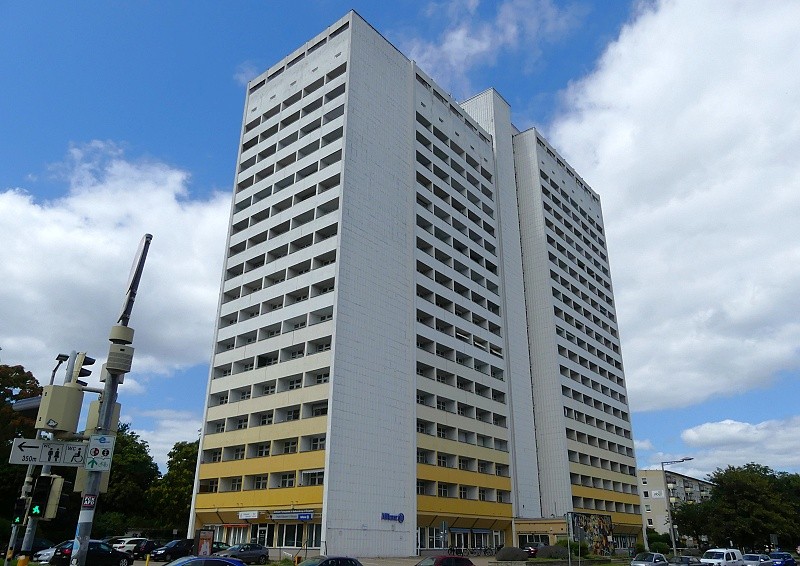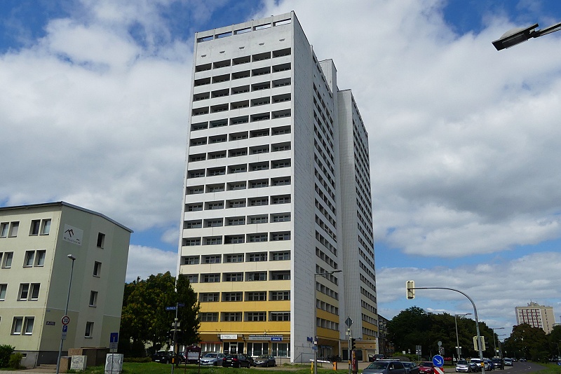 26.07.2025: Das Hochhaus Jakobstrasse 7 in Magdeburg ist das höchste Wohnhochhaus der Stadt, gebaut bis 1974 in sogenannter Gleitbauweise. Es handelt sich um ein ca. 65 m hohes Hochhaus mit Unterkellerung, obergeschossiger Wohnnutzung und Kleingeschäften und Büros im Erdgeschoss. Die Gebäudestruktur besteht aus einem Süd- und einem Nordteil, verbunden mit einem Verkehrs- und Erschliessungskern als Mittelteil. Der Südteil besteht aus 16 Obergeschossen sowie Erdgeschoss, der Nordteil aus 18 Obergeschossen und Erdgeschoss: