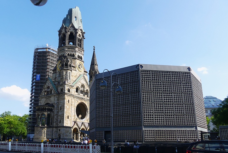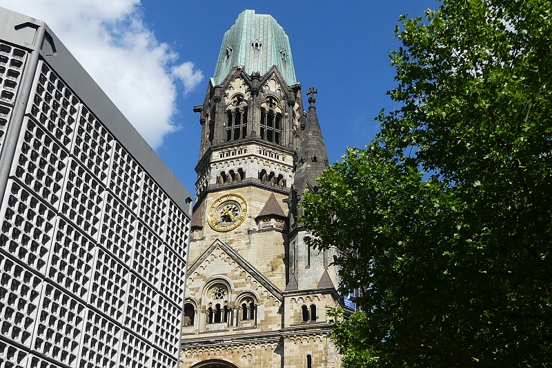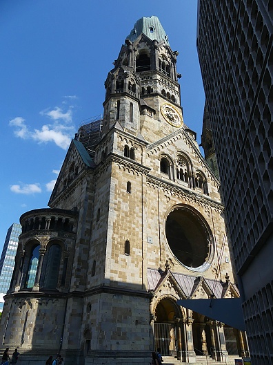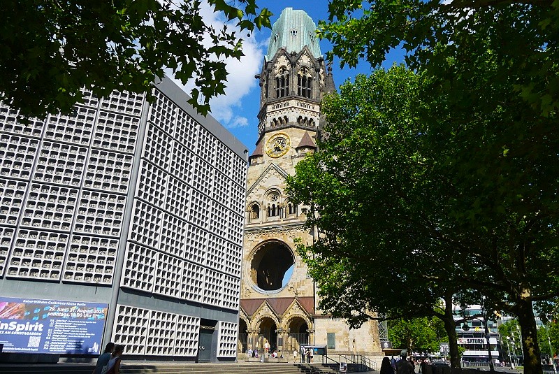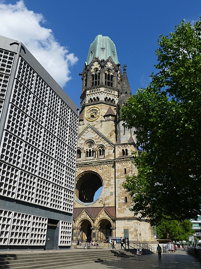 27.07.2025: Die Kaiser-Wilhelm-Gedächtniskirche im Zentrum der City-West am Breitscheidplatz gehört zu den bekanntesten Wahrzeichen und Sehenswürdigkeiten Berlins. Am auffälligsten ist die Turmruine, die in den Himmel ragt. Sie wurde während des Zweiten Weltkrieges 1943 beschädigt und ist heute ein Mahnmal gegen Krieg und Zerstörung. Die Kaier-Wilhelm-Gedächniskirche steht mitten auf dem Breitscheidplatz im westlichen Zentrum Berlins. Die viel besuchte Sehenswürdigkeit der Stadt befindet sich in guter Nachbarschaft zu weiteren Berliner Attraktionen, nicht weit entfernt liegen der Berliner Zoo, der Kurfürstendamm und das KaDeWe. Schon von Weitem fällt die zerstörte Turmspitze der Kirche ins Auge. Sie wurde nach ihrer Zerstörung während des Zweiten Weltkrieges 1943 zwar mehrfach restauriert, aber absichtlich nicht wieder aufgebaut. Sie soll als Mahnmal gegen Krieg und Zerstörung dienen. Im November 1943 wurde die Kaiser-Wilhelm-Kirche bei einem Bombenangriff weitgehend zerstört. In den Nachkriegsjahren wurde die Kirchenruine zum Symbol des aus Ruinen auferstandenen Berlin. Im März 1957 gewann der Architekt Egon Eiermann einen ausgeschrieben Wettbewerb mit seinem Entwurf, der den vollständigen Abriss der Ruine vorschlug und einen kompletten Neubau vorsah. Die Frage nach dem Verbleib der Ruine führte zu einer ernsten öffentlichen Debatte und endete mit einem Kompromiss. Der rund 68 Meter hohe Turmcorpus blieb als Mahnmal gegen den Krieg erhalten und wurde durch ein vierteiliges Bauensemble ergänzt. Dazu zählen das achteckige Kirchenschiff, der sechseckige Glockenturm, die viereckige Kapelle und das Foyer. Nach fast vierjähriger Bauzeit konnte die Kirche am 17. Dezember 1961 eingeweiht werden. Die Berliner fanden für die beiden modernen Gebäude schnell die durchaus passenden Bezeichnungen Lippenstift und Puderdose: