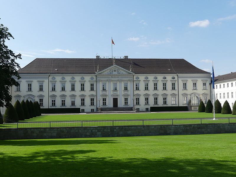 27.07.2025: Das Schloss im neoklassizistischen Baustil steht direkt am Spreeufer im nördlichen Teil des Tiergartens und stellt offiziell die Residenz des jeweils amtierenden deutschen Bundespräsidenten dar. Die zweigeschossige Dreiflügelanlage Schloss Bellevue wurde 1786 als private Residenz für Ferdinand von Preussen, dem jüngsten Bruder von Friedrich dem Grossen, nach den Plänen des Architekten Philipp Daniel Boumann gebaut. Über die Jahrhunderte wurde das Schloss Bellevue vom Hof des letzten deutschen Kaisers Wilhelm II. (1888-1918) genutzt und 1939 zum Gasthaus der Reichsregierung umfunktioniert. Das heutige Gebäude ist die rekonstruierte Version von 1959. Lediglich der vom Architekten Carl Gotthardt Langhans entworfene Ballsaal im Obergeschoss des Schlosses ist in seinem Original erhalten geblieben. Weitere Büroräume des Bundespräsidenten befinden sich in dem neuen Gebäude südlich des Schlosses, dem Bundespräsidialamt – ein Bauwerk, das mit seiner polierten schwarzen Granitfassade und dem grossen Glasdach optisch in starkem Kontrast zum Schloss steht: