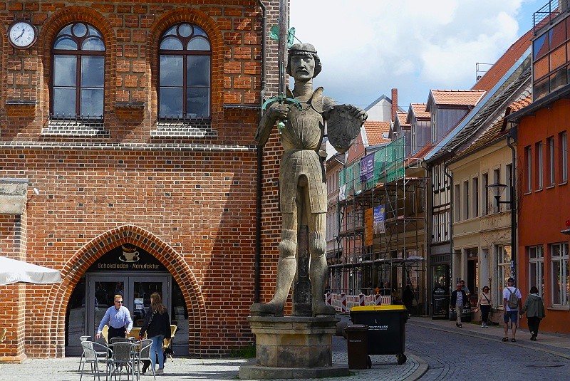 29.07.2025: Der Stendaler Roland, eine 1525 errichtete Rolandstatue auf dem Stendaler Marktplatz vor der Gerichtslaube des Rathauses, ist ein Wahrzeichen Stendals. Die Figur ist 7,80 Meter hoch. Der Roland ist ein städtisches Rechtssymbol, das die hohe Gerichtsbarkeit, Marktfreiheit oder bestimmte Stadtrechte verkörperte. Die Figur stellt den aus Liedern und Epen (Rolandslied) bekannten Heerführer Roland und angeblichen Neffen Karls des Grossen dar. Er ist als Ritter mit Schnurrbart dargestellt, der einen Plattenpanzer mit aufgelegten Wulsten trägt. In der rechten Hand trägt er ein eisernes Schwert mit ursprünglich vergoldetem Knauf und Griff, in der linken Hand hält er einen Schild mit dem städtischen Wappen, einen Brandenburgischen Adler, unter dessen Füssen zwei an den Ecken ausgezackte Quadrate (Steine) liegen. Um die Haare trägt er einen Reif in Form eines wulstförmigen Stoffbandes (Pausch), mit einem eisernen Kiefernzweig an der rechten Seite: