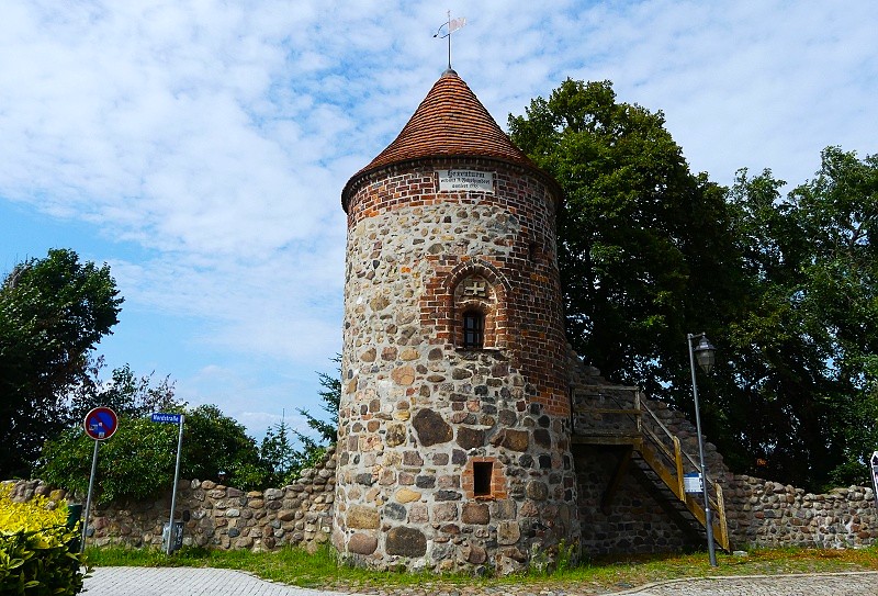 28.07.2025: Der Wachturm ist ein Relikt der ersten Stadtbefestigung aus dem 11. Jahrhundert, vormals eckig, wurde er auf Grund der besseren Verteidigung gegen Kanonenkugeln abgerundet. Neben dem Turm befindet sich die sogenannte Katzentreppe, über die steinerne Geschosse für die Katapulte und Schleuder, auch Katzen genannt, herangeschafft wurden. Später wurden diese Steine als sogenannte Katzenköpfe beim Strassenbau verwendet. Seinen Namen erhielt der Hexenturm zur Zeit der Hexenverfolgung als dort die vermeintlichen Hexen eingesperrt wurden. So diente der Turm mit seinem sechs Meter tiefen Verlies ab dem 17. Jahrhundert der Inhaftierung von Frauen. In diese sogenannten Hexenprozesse waren auch Töchter bekannter Burger Familien involviert. Die bekanntesten Insassinnen waren z.B. die als Hexe bezichtigte Schwarze Barbara sowie die als Kindesmörderin überführte Marie Huhn. Bis 1846 wurde der Turm so als Kriminalgefängnis für lüderliche Mädgens genutzt. 1885 sollte er abgerissen werden, weil er keinen Verwendungszweck mehr erfüllte. Die Regierung in Magdeburg verhinderte dies. Zehn Jahre später wurde der Abriss des Turms erneut diskutiert. Ab 1985 wurde der Hexenturm saniert und schliesslich in den Stand eines Denkmals erhoben: