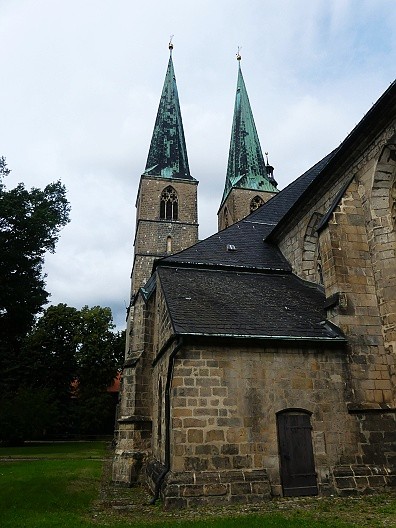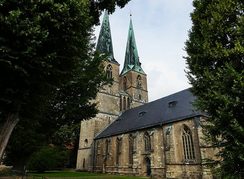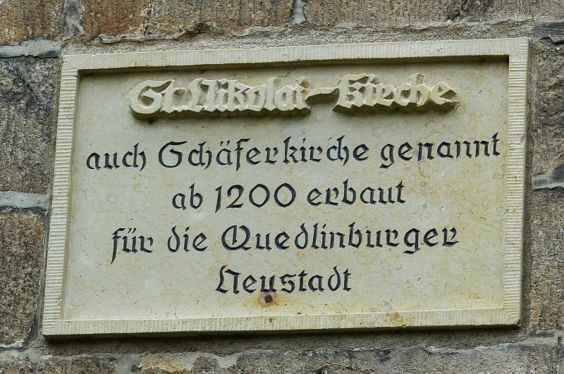 03.08.2025: Die Nikolaikirche wurde zur Ehre Gottes errichtet. Ihre Anfänge vermutet man um 1200. Romanische Spuren sind bis heute in der Kirche zu finden. Einer alten Sage nach soll ein Schäfer, der durch einen Goldfund zu Reichtum kam, an der Finanzierung des Baus massgeblich beteiligt gewesen sein. Deshalb steht bis heute auf einer der beiden Turmseiten ein in der Barockzeit angefertigter Schäfer mit seinem Hund. Der Volksmund nennt die Nikolaikirche Schäferkirche. Im 14. Jahrhundert wurde die Nikolaikirche zu einer gotischen Kirche umgebaut. Die Türme erhielten bereits da ihre heutige Höhe von 72 m und es wurden die Gewölbe über den Kirchenschiffen eingezogen. Auch die grosse wertvolle Glocke mit ihren feinen Ritzzeichnungen im Südturm stammt aus dieser Zeit (1333). Annähernd die gesamte Innenausstattung (Kanzel/Hochaltar/Empore) stammt aus der Zeit des Barock. Andere Ausstattungstücke (Hl. Godehard/ 2 Pietas, Mose, romanisches Kruzifix) datieren deutlich früher. 1540 wurde unter der Äbtissin Anna II. von Stolberg die Reformation in Quedlinburg eingeführt. Seit dieser Zeit ist die St. Nikolaikirche eine evangelische Kirche. Von 1590 – 1599 wirkte an der Nikolaikirche der Verfasser der „Sechs Bücher vom wahren Christentum“, der berühmte Theologe Johann Arnd. Von 1737 – 1759 war Johann Christian Erxleben Pfarrer der Nikolaikirche. Er war der Ehemann von Dorothea Christiane Erxleben. Sie war die erste Frau in der deutschen Geschichte, die an einer Universität (Halle an der Saale) ihren Doktor der Medizin machen konnte: