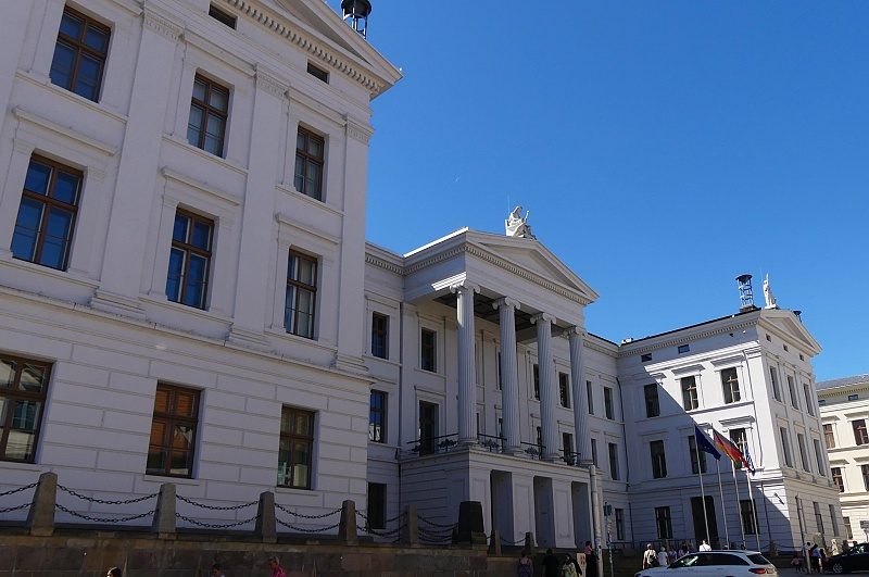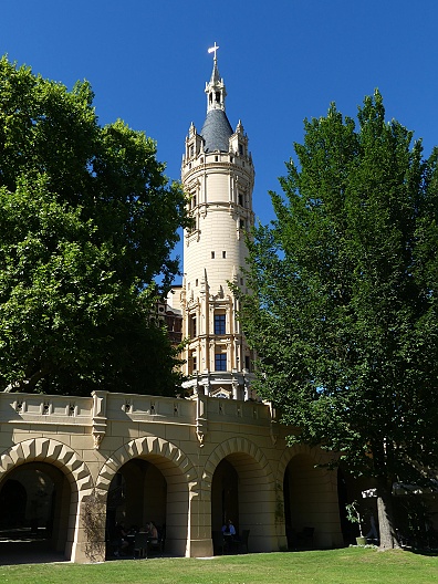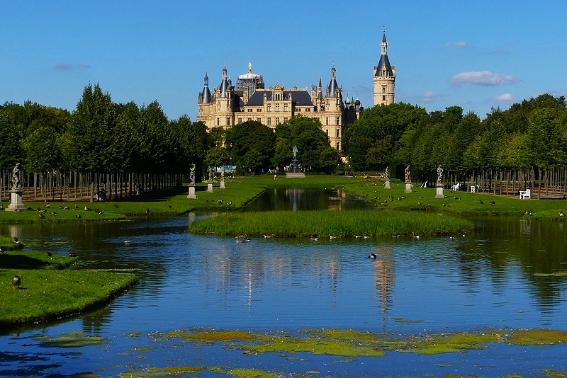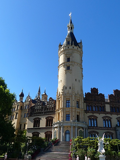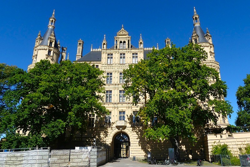 18.08.2025: Das Residenzschloss ist der Kern des Residenzensembles Schwerin, auf das alle Sichtachsen fokussiert sind. Seine Geschichte als Herrschaftsstandort reicht bis in die slawische Zeit zurück. Der letzte freie Fürst der Obotriten, Niklot, wurde 1160 von Heinrich dem Löwen besiegt, der daraufhin auf den Resten des slawischen Burgwalls eine Deutsche Burg errichten liess und die Stadt Schwerin gründete. Fast 200 Jahre später, 1348, erhielten die christianisierten Nachfahren Niklots die Burg zurück. Seitdem regierten sie nahezu ohne Unterbrechung bis 1918 von hier aus den Schweriner Landesteil Mecklenburgs. 1918, mit der Novemberrevolution, war Friedrich Franz IV. gezwungen abzudanken. Er und seine Familie mussten aus dem Residenzschloss ausziehen. Nach dem Weggang der Grossherzogsfamilie und dem Übergang des Schlosses in das Eigentum des Staates diente es wiederholt als Sitz des Landtages, in der Weimarer Republik und von 1948-1952. Seit 1990 tagt der Landtag des neu gegründeten Landes Mecklenburg-Vorpommern in dem altehrwürdigen Gebäude. Während und nach dem Zweiten Weltkrieg wurde es auch als Lazarett und Flüchtlingsunterkunft genutzt. Der DDR diente das Schloss unter anderem als Sitz des Bezirkstages Schwerin, als Internatsschule für Erzieherinnen, als Probe- und Spielstätte der Schweriner Philharmonie sowie als Aussenstelle der Musikhochschule Hanns EislerBerlin. Ausserdem wurde es seit den 1920er Jahren museal genutzt. Auch heute kann man das Museum mit historisch ausgestatteten Thron- und Prunkappartements besichtigen. Das Schloss erlebte im Wesentlichen zwei Umbauphasen: im 16. Jahrhundert unter Herzog Johann Albrecht I. und im 19. Jahrhundert unter Grossherzog Friedrich Franz II. Zudem gab es kurz vor Ausbruch des Dreissigjährigen Krieges Pläne, die Residenz im Stil der Renaissance umzugestalten. Die vollständige Umsetzung wurde jedoch durch den jahrzehntelang anhaltenden Konflikt vereitelt. Das heutige Erscheinungsbild setzt sich hauptsächlich aus diesen Umbauphasen zusammen, auch wenn der Kern einiger Gebäude, wie der des Bischofshauses, um einiges älter ist. Die prägendste Phase war jene von 1843 bis 1857, bestimmt durch die Hofbaumeister Georg Adolph Demmler, Hermann Willebrand und den Baumeister des preussischen Königs Friedrich August Stüler. Des weiteren war Gottfried Semper mit Entwürfen am Umbau beteiligt. Die Schlosskirche, der erste protestantische Kirchenneubau Mecklenburgs, stammt allerdings noch aus dem 16. Jahrhundert. Im 19. Jahrhundert bekam sie einen Choranbau und erfuhr einige Umgestaltungen im Inneren: