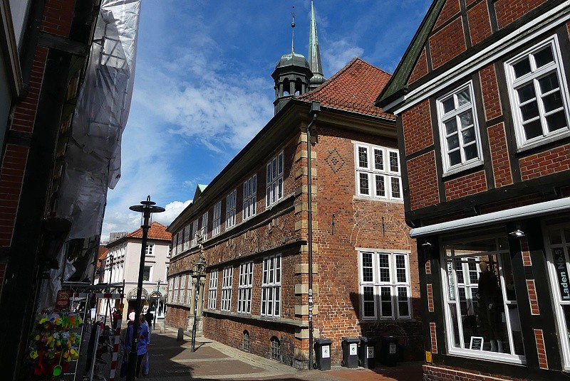 27.08.2025: Das Rathaus Stade an der Hökerstrasse wurde zwischen 1667 und 1668 auf den Ruinen des alten Rathauses von 1279 errichtet. Nach dem Dreissigjährigen Krieg zwischen Katholiken und Protestanten ereignete sich 1659 ein grosser Brand in Stade, bei dem zwei Drittel der Stadt zerstört wurden. Darunter auch das alte Rathaus. Nur das Gewölbe sowie der Ratskeller blieben verschont. Das Gebäude zeigt Stilelemente der Spätrenaissance sowie des Hochbarock. Im Rathaus befindet sich neben dem Ratskeller auch das Standesamt der Stadt Stade. Seit der Errichtung hat sich am äusseren Erscheinungsbild nur wenig verändert. Das Hauptgebäude (Westflügel) mit zwei Etagen zu Seiten der Hökerstraße ist 35 Meter lang. Der Ostflügel misst hingegen 31 Meter. Als Baumaterial wurde hauptsächlich roter Backstein gewählt, sowie roter Sandstein für die Ecken und Schmuckelemente. Teilweise stammen diese Werkstoffe noch vom alten Rathaus, so wie die grossen Granitquader auf denen das Gebäude zum Teil basiert. Auf dem Dach befindet sich ein Dachreiter mit einer Wetterfahne. Über der Haupteingangstür zum Stader Rathaus an der Hökerstrasse befindet sich ein Sandsteinportal. Dort halten zwei schwedische Löwen das Königswappen mit der lateinischen Inschrift JUSTITIA ET PIETAS PAX ET CONCORDIA VERNENT – Gerechtigkeit und Frömmigkeit, Friede und Eintracht mögen blühen. Die Schweden hatte die Stadt im Jahr 1645 unter dessen deutschen Heerführer Hans-Christoph Königsmarck erobert und 1712 zur Festung ausgebaut. Darunter befindet sich etwas kleiner, das Wappen der Stadt Stade. Gekrönt wird das Portal von Merkur, Beschützer der Kaufleute und Händler. Zur linken befinden sich die Figuren Prudentia (Klugheit) sowie rechts die Justitia (Gerechtigkeit):