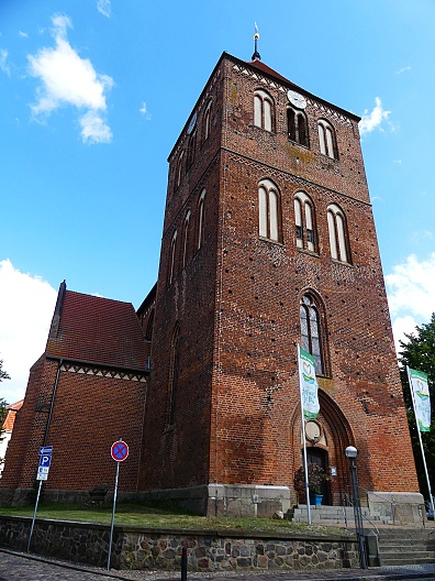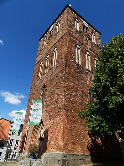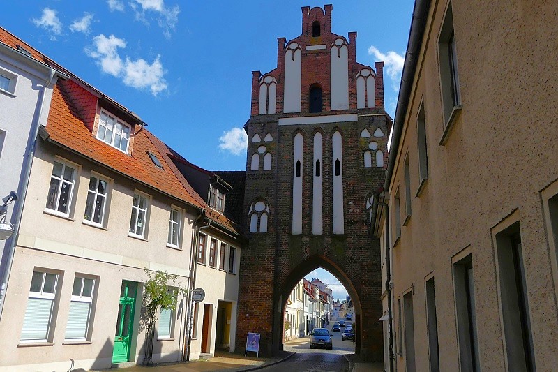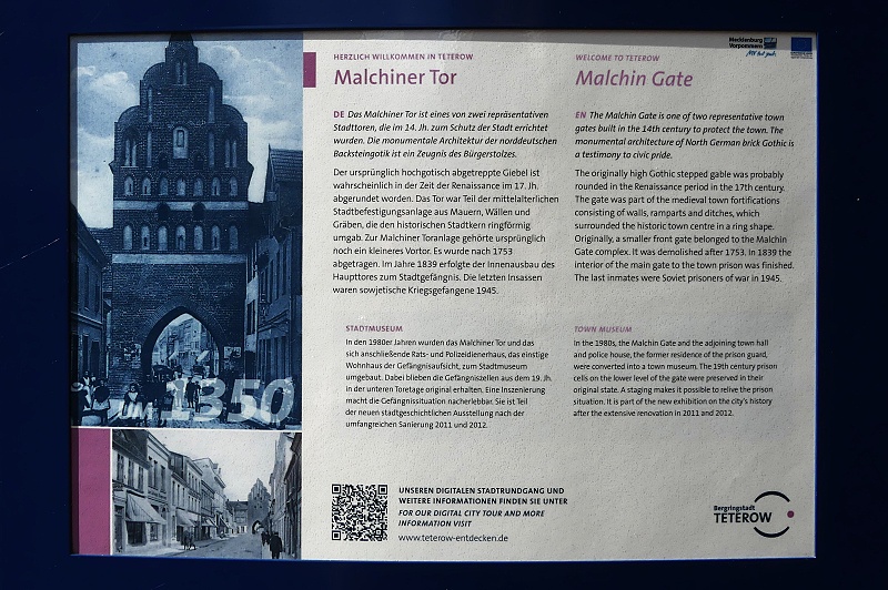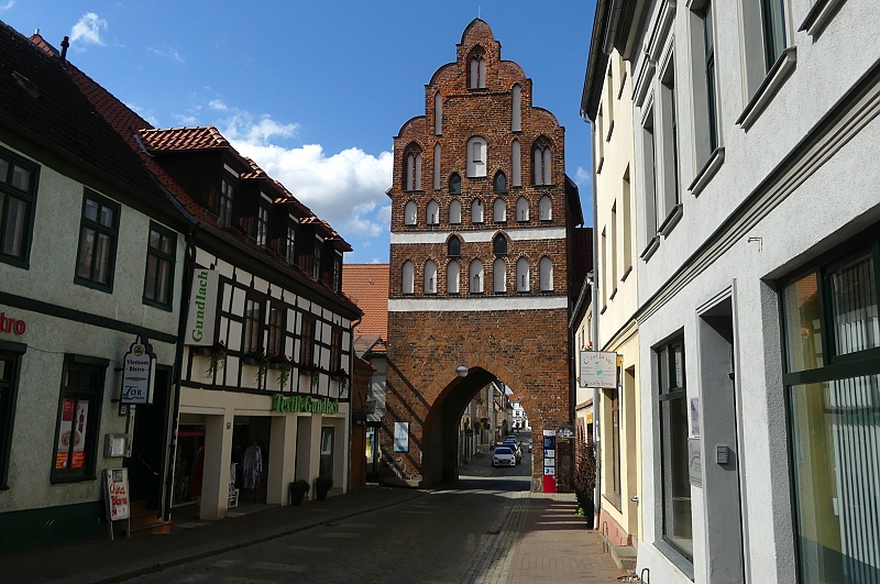 21.08.2025: Das gotische viergeschossige Backsteintor aus dem 14. Jahrhundert im Südosten des Stadtzentrums sicherte die Strasse nach Malchin ab. Das Tor verfügt über eine spitzbogige Durchfahrt bei einer quadratischen Grundfläche. Die Durchfahrt wurde nachträglich vergrössert. Geschmückt ist es auf der Feldseite mit zwei grossen waagrechten Putzblenden und Reihen von Spitzbogenblenden verschiedener Grössen in den Obergeschossen. Die Stadtseite ist weniger auffällig geschmückt mit einer Reihe Spitzbogenblenden im oberen Gebäudeteil. Beide Seiten werden mit einem gestaffelten Lünettengiebel geschmückt. Das Gebäude diente im 19. Jahrhundert als Stadtgefängnis und beherbergt seit 1990 das Stadtmuseum. Neben den Gefängniszellen, die besichtigt werden können, informiert es über die slawische Frühgeschichte, sowie über die Orts- und Regionalgeschichte: