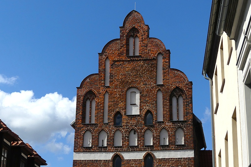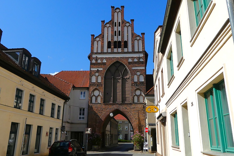 21.08.2025: Das gotische mehrgeschossige Backsteintor aus der Mitte des 14. Jahrhunderts im Nordwesten der Altstadt sicherte die Landstrassen nach Rostock und Güstrow ab. Das Tor verfügt über eine spitzbogige Durchfahrt bei einer quadratischen Grundfläche. Die Durchfahrt wurde nachträglich vergrössert. Geschmückt ist das Tor auf der Stadtseite mit einer unverputzten grossen Putzblende, kleineren Spitzbogenblenden verschiedener Grösse in den Obergeschossen und einem Staffelgiebel. Die Feldseite verfügt über drei markante Putzblenden im zentralen Teil, um die mehrere kleine Putzblenden angeordnet sind: