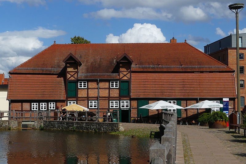 21.08.2025: Die Stadtmühle Teterow wurde 1800 gebaut. Sie beherbergt heute eine Gaststätte und ein Kulturzentrum. Das eingeschossige Fachwerkgebäude der Stadtmühle mit Mansarddach ist ein Beispiel für Bauten des Wiederaufbaus. Prägend sind die beiden Dacherker. Die Mühle stand am Mühlenteich, aufgestaut durch die Kleine Peene. Sie wurde betrieben durch ein unterschlächtiges Wasserrad, bei dem das Wasser unter dem Rad einen Kropf durchfliesst. Der offene Wasserzufluss wurde im Stadtinneren 1885 überdeckt und 2002/03 im Rahmen der Städtebauförderung im Bereich der Seestrasse wieder geöffnet. Ab 1973 gehörte die Mühle zur staatlichen Landwirtschaftlichen Produktionsgenossenschaft (LPG). Bis 1991 war es ein Mischfutterwerk der LPG: