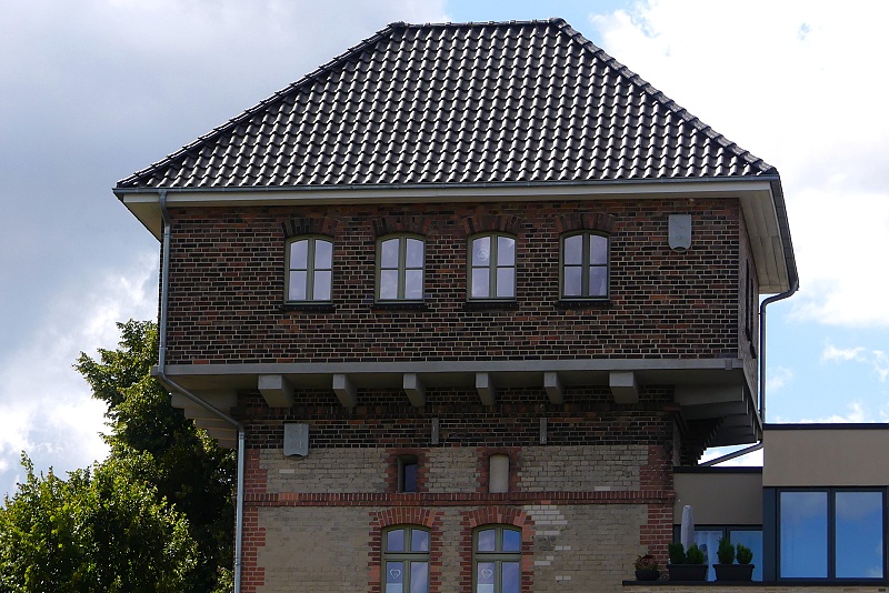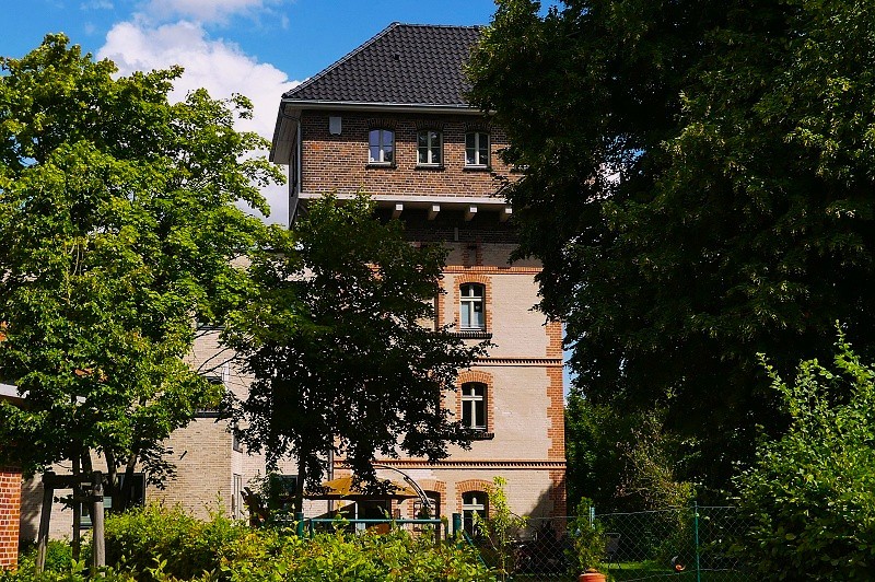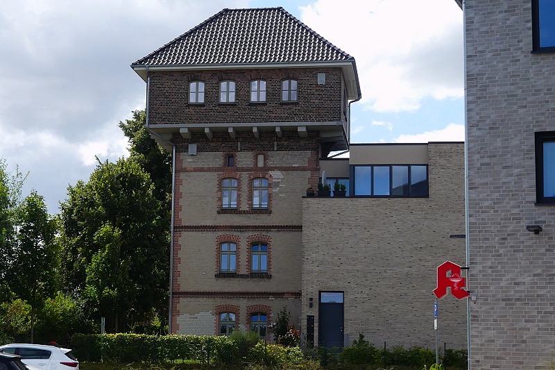 21.08.2025: Im Jahr 1907 wurde der Turm erbaut und 1940 der Turmkopf neu in Stahlbeton und Klinker errichtet. In den 1970er Jahren endete der Betrieb des viergeschossigen Wasserturms , und 2011 erwarb ihn nach Leerstand die Stadt für ihre Wohnungsgesellschaft TWG. Im Turm und einem neuen dreigeschossigen Anbau entstanden nach einem Wettbewerb und einer Sanierung nach Plänen von Siegmund Konermann (Lübeck) im Rahmen der Städtebauförderung bis 2018 fünf Wohnungen: