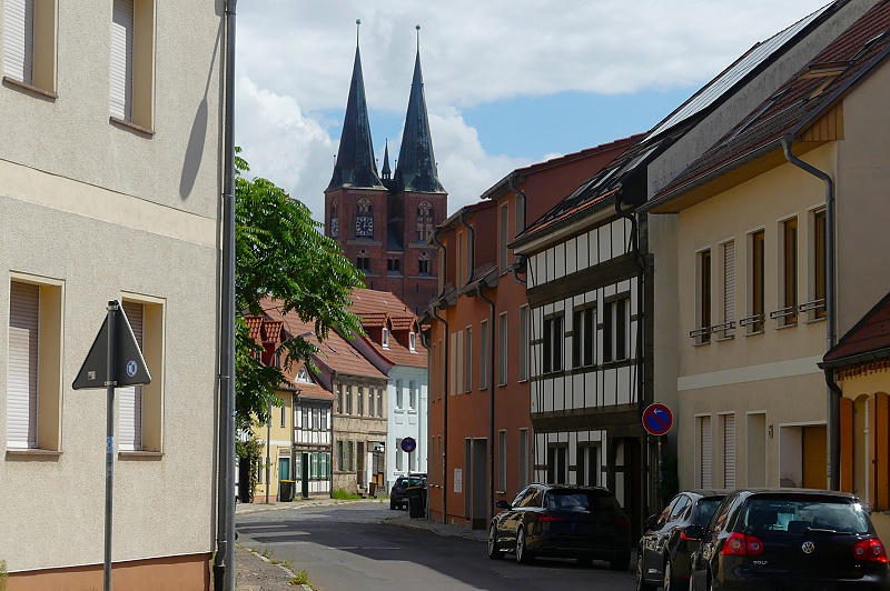 29.07.2025: Die Jacobikirche ist die zweite der drei Stendaler Grosskirchen. Sie stammt aus dem 14. und 15. Jahrhundert. Ihr Turm wurde von 1893 bis 1901 errichtet und steht anstelle des ursprünglichen Turmes, der 1808 eingestürzt war. An ihrer Südseite ist eine aus Sandstein gefertigte Tafel eingelassen, deren Inschrift denjenigen einen Ablass verspricht, die sich am Bau beteiligen. Auch in dieser Kirche zeigt die wertvolle Ausstattung die Bedeutung und den Reichtum der alten Hansestadt. Die geschnitzte Chorschranke gehört in das erste Viertel des 16. Jahrhunderts. Das Vorbild aus der Marienkirche ist unverkennbar, im Chor befindet sich ein vierteiliges geschnitztes Chorgestühl aus der Zeit um 1420/30 und an der Nordseite des Chores ein eingebauter Schrank mit Flachschnitzerei, um 1500. Der Sandsteinaltar von 1600-1603 besitzt einen dreigeschossigen Aufbau. Über dem Hauptfeld hat der Meister seinen Schild angebracht. Ein besonderes Kunstwerk ist die Kanzel aus Sandstein aus dem Jahre 1612 von Hans Hacke aus Werben in der Altmark. Die lebensgrosse Tragefigur stellt Jakobus den Älteren dar als Schutzpatron der Pilger mit dem Pilgerzeichen am Hut, der Muschel:
