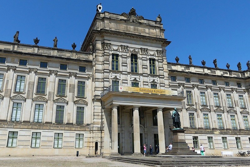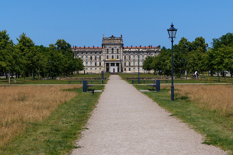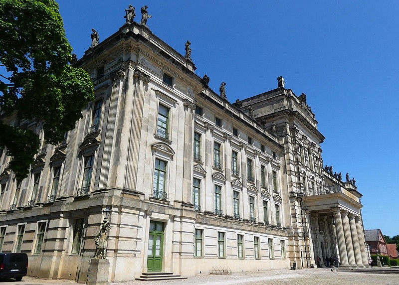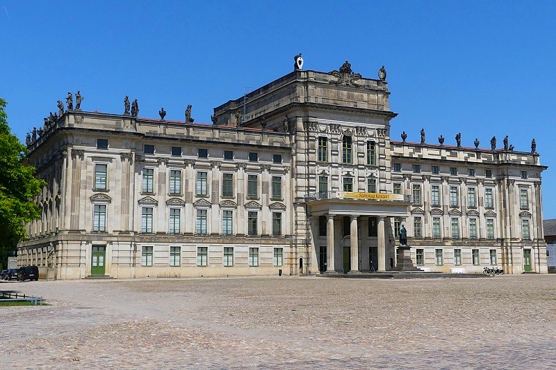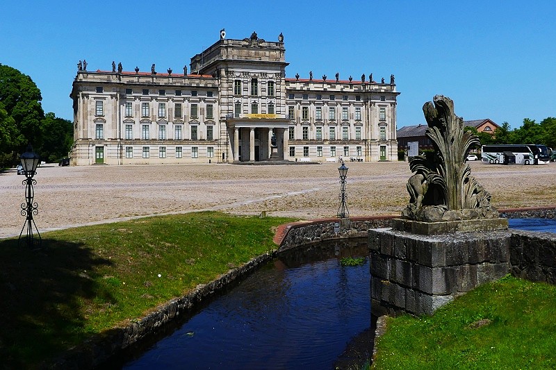 21.06.2025: Unmittelbar hinter dem alten Jagdschloss errichtete der Architekt Johann Joachim Busch 1772 – 1776 das neue, repräsentative Residenzschloss der mecklenburgischen Herzöge. Der Bauherr, der den Ruf eines naturwissenschaftlich gebildeten Regenten genoss, nahm selbst regen Einfluss auf das Baugeschehen und entwarf u.a. das Figurenprogramm der Attika. Unter den im Barock üblichen Personifikationen der Künste und der Wissenschaften sind auch einzigartige Allegorien zu finden, wie die der Hydrodynamik oder der Feldmesslehre. Bald nach Fertigstellung des Schlosses bezog der Herzog das neue Domizil und liess das alte Jagdschloss abtragen. Im Mitteltrakt des Schlosses erstreckt sich der Goldene Saal über zwei Stockwerke. Grosse Fenster, Spiegel und Kristallüster lassen den Festsaal in höfischem Glanz erstrahlen. Die vergoldeten Dekorationen, die Wände, Decken und Türen verzieren, sind Produkte der herzoglichen Carton – Fabrik zu Ludwigslust. Die historisch ausgestatteten Räume im Schloss geben dem Besucher einen Einblick in die höfische Kunst und Wohnkultur des 18./19. Jahrhunderts. Ein Kabinett mit Miniaturen, kostbare Jagd- und Prunkwaffen, kunstvolle Möbel sowie die Werke des französischen Hofmalers Jean Baptiste Oudry künden von der Sammelleidenschaft der mecklenburgischen Herzöge. Gemälde von Georg David Matthieu und Christian Ludwig Seehas stellen die einstigen Bewohner des Schlosses vor. Herzstück des Schlosses ist der Goldene Saal mit seinen monumentalen Säulen, den kostbaren Kristalllüstern und dem restaurierten Parkettfussboden. Besonders beeindruckend erscheint aber auch die Gemäldegalerie mit einer Fülle von Gemälden und Korkmodellen: