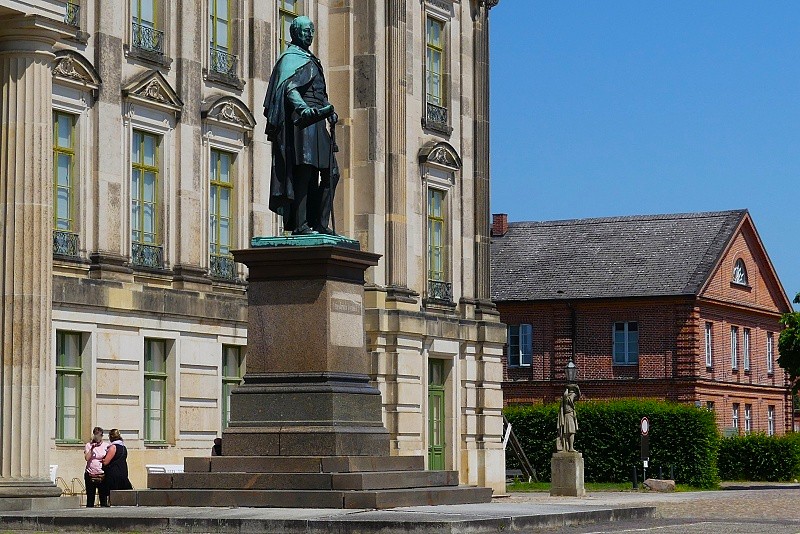 Die Statue von Friedrich Franz I. steht vor dem Schloss: