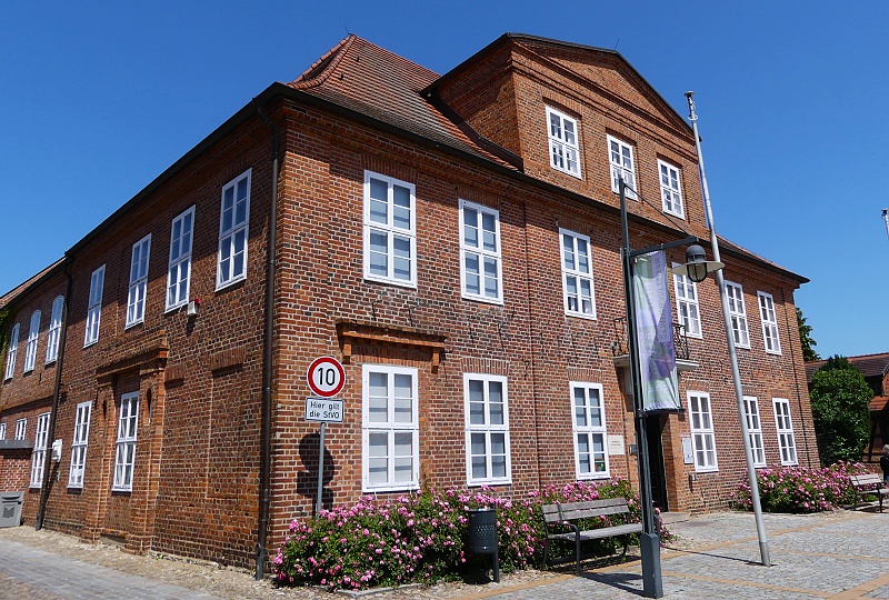 21.06.2025: In der Ludwigsluster Schlossstraße befindet sich das heutige Rathaus. Der zweigeschossige Backsteinbau war jedoch nicht immer Sitz der Stadtverwaltung. Errichtet wurde es im Jahre 1780 von Johann Joachim Busch und diente zunächst als Gerichtshaus, dessen Obergeschoss die Carton-Fabrique beherbergte. Bis etwa 1817 wurde in der Schlossstraße 38 Pappmaché hergestellt, aus dem Kunstgegenstände und Schmuckelemente für das Schloss gefertigt wurden. Viele Unikate können im Ludwigsluster Schloss noch heute bewundert werden. In jener Zeit war das damalige Gerichtshaus auch das Gefangenenhaus, in dessen Erdgeschoss sowohl der Gerichtsrat als auch der Gefangenenwärter wohnten. 1884 begann ein neuer Abschnitt in der wechselvollen Geschichte des Hauses. Die gerade erst gegründete städtische Sparkasse zog in das Obergeschoss ein. Später übernahm sie auch die Räumlichkeiten im Erdgeschoss. Bis 1935 war die Sparkasse Hauptnutzer des Gebäudes. Seitdem ist die Schlossstraße 38 städtisches Rathaus für Ludwigslust. Um den vielfältigen Aufgaben gerecht werden zu können, wurde es Anfang der 90er Jahre zunächst um einen Anbau erweitert, im Anschluss daran wurde das historische Rathaus umfangreich saniert. Auch die städtische Bibliothek ist seitdem hier untergebracht: