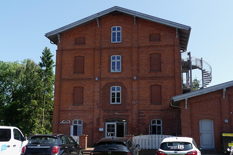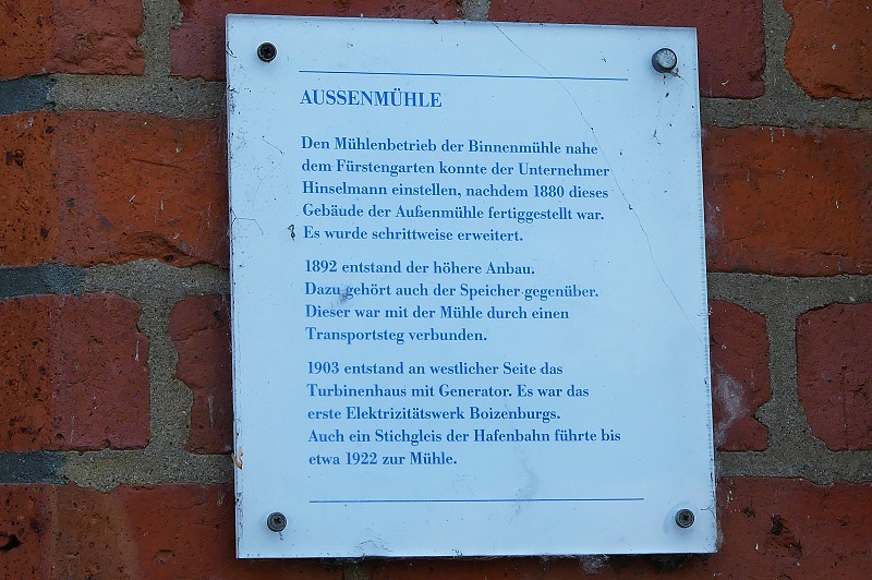 12.06.2025: Die ehemalige Wassermühle Boizenburg am Mühlenteich 1 ausserhalb des Wallringes stammt von 1880 und ist heute ein Wohnhaus. Nicolaus Hinselmann (1803–1887) aus Neumünster kaufte 1866 in Boizenburg von der grossherzoglichen Kammer die Mühlenanlagen mit der Binnenmühle beim Fürstengarten, der Aussenmühle und der Windmühle am Herrengarten. Die Aussenmühle wurde 1880 erneuert und dann schrittweise erweitert. Sie diente als Getreidemühle. Die ein- und dreigeschossige verklinkerte Aussenmühle über der Boize und am früheren Mühlenteich wurde 1880 saniert und erweitert. Die Binnenmühle konnte nach Inbetriebnahme der sanierten Aussenmühle stillgelegt werden. Der Sohn Ludwig Hinselmann (1850–1926) übernahm den Betrieb und er baute 1892 den fünfgeschossigen Speicher. Mühle und Speicher verband ein Transportsteg. 1903 errichtete Hinselmann an der Aussenmühle ein Turbinenhaus mit Generator als erstes Boizenburger Elektrizitätswerk. Das Haus wurde in den 1990er/2000er Jahren saniert und zum Wohnhaus umgebaut. Die Gebäude stehen unter Denkmalschutz: