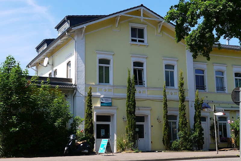04.04.2025: Am 22. Februar 1862 baute die Wiesbadener Eisenbahn-Gesellschaft die 56,6 km lange rechte Rheinstrecke zwischen Rüdesheim und Oberlahnstein weiter aus. Die zunächst eingleisige Gesamtstrecke von Wiesbaden nach Niederlahnstein wurde am 3. Juni 1864 in Betrieb genommen. Die Strecke dient heute in der Hauptsache dem Güterverkehr. Im Personenverkehr wird der Bahnhof stündlich von der SPNV-Linie RB 10 (Rheingau-Linie) bedient. Das Empfangsgebäude befand sich südlich vom Ortskern in einer isolierten Lage. Es handelt sich um einen traufenständigen, variierten Typenbau des Klassizismus von 1862 und entstand nach Entwürfen von Heinrich Velde: