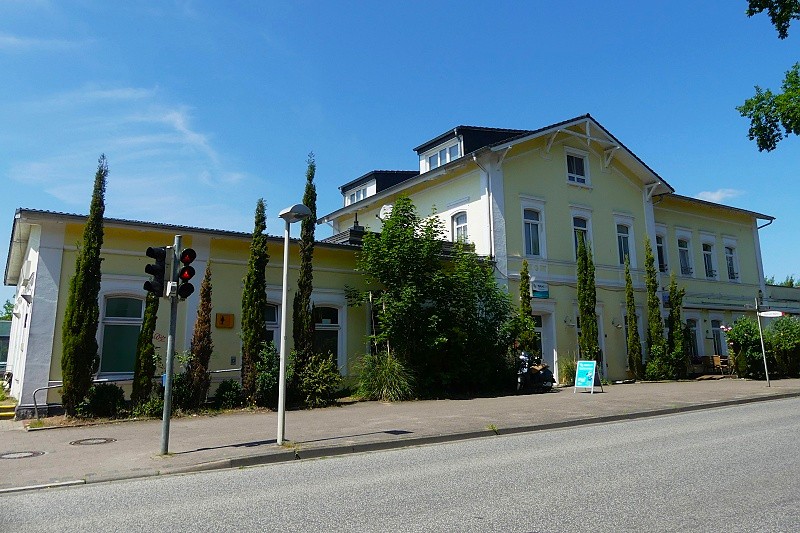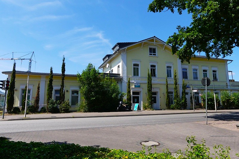 13.06.2025: Glückstadt ist mit seinem Bahnhof an der Marschbahn ins Netz des Schienenpersonennahverkehrs vom Nahverkehrsverbund Schleswig-Holstein eingebunden. Hier halten zwei Regionalbahnlinien (RB 61 und RB 71) auf dem Fahrtweg von Hamburg zum Bahnhof Itzehoe. Ausgangsbahnhof in Hamburg ist bei der RB 61 der dortige Bahnhof, die Linie 71 verkehrt ab Hamburg-Altona. Das aktuell mit dem Betrieb betraute Eisenbahnverkehrsunternehmen ist die Nordbahn Eisenbahngesellschaft. Das 1938 errichtete Gebäude ist bereits das dritte Bahnhofgebäude in Glückstadt. Der erste Bahnhof entstand als Kopfbahnhof an der Hafenwurzel in gradliniger Verlängerung der Strecke von Elmshorn. Er war von 1845 bis 1857 der Endbahnhof der neu gebauten Strecke Elmshorn-Glückstadt. Als die Bahnlinie 1857 nach Itzehoe verlängert wurde, hat man die Bahntrasse östlich an der Altstadt vorbeigeführt und einen neuen Bahnhof bei den Festungsanlagen errichtet. Das erste Bahnhofsgebäude dort stand von 1857 bis 1938. Eine Holzgaststätte, der sogenannte Anlagenpavillion, wurde in die Bahnhofanlagen integriert. Nach dem Bau der Kaserne 1935/37 reichte das kleine Empfangsgebäude für das gestiegene Fahrgastaufkommen nicht mehr aus. Nach dessen Abriss entstand 1938 das heutige Backsteingebäude an der Stelle des ehemaligen Anlagenpavillions. Beim Abriss hatte man Platz für einen grosszügigen Vorplatz gewonnen. Die Nutzung des Empfangsgebäudes für den Bahnverkehr wurde in den 1980er Jahren nach und nach aufgegeben. 2012 erfolgte der Verkauf des Gebäudes: