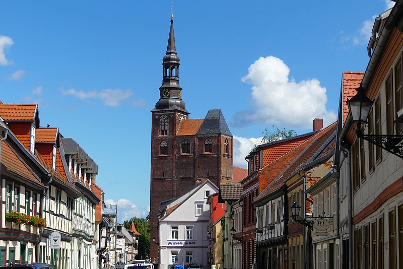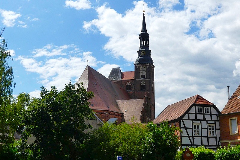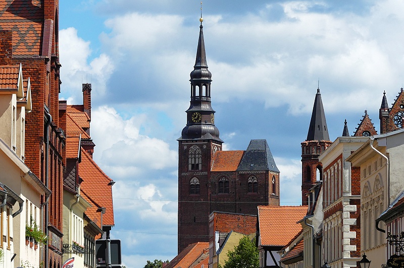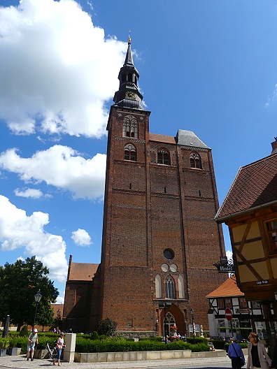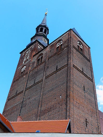 29.07.2025: Hinter dem Rathaus recken sich die gotischen Türme der Kirche St. Marien eindrucksvoll in die Höhe. Die Kirche wurde 1283 erstmals erwähnt. Zunächst wurde die St.-Marien-Kirche als romanische Basilika gebaut. Im späten 14. Jahrhundert erhielt dieser Bau zwei Türme. 1420 begann man damit an Stelle der romanischen Basilika eine spätgotische dreischiffige Hallenkirche mit Umgangschor zu setzen. Schon 1447 wurde das Kirchenschiff überwölbt und am Bartholomäustag desselben Jahres geweiht. Die Marienkapelle baute man von 1470 bis 1473 an. In dieser Zeit wurde auch der Hochaltar aufgestellt. Die heutigen Doppeltürme wurden um 1516 vollendet. Die Kirche diente der Kaufmannsgilde als Hauptpfarrkirche und schliesst sich als Ratskirche direkt ans Rathaus an. 1538 wurde in der Marienkirche die erste reformatorische Predigt in der Mark Brandenburg gehalten. Ein besonderes Ausstattungsstück ist die gotische Bronzefünte, die im 13. Jahrhundert die steinernen Taufbecken vor allem in den Hansestädten und an der südlichen Ostseeküste ablösten. Dieses Taufbecken stammt von 1474 und ruht auf den vier Evangelisten: Matthäus als Engel, Johannes mit einem Adlerkopf, Lucas mit einem Stierkopf und Markus mit einem Löwenkopf, bei dem sich als Besonderheit die Zunge bewegen lässt. Ein weiteres einzigartiges Ausstellungsstück ist die astronomische Uhr, die sich unterhalb der Orgelempore befindet. Sie ist, wie alle astronomischen Uhren, mit drei mal drei Metern sehr gross und entstand, wie im Tierkreiszeichen Löwe erkenntlich, im Jahr 1552. Die Tageszeit wird auf ihr in einer 24-Stunden-Einteilung gezeigt: