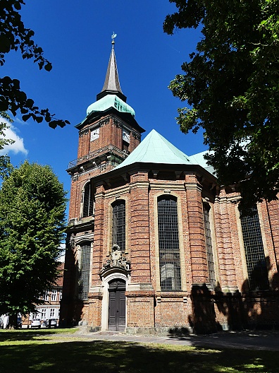 11.08.2025: Gegenüber vom Schloss liess Gutsherr Peter Rantzau eine Kirche errichten, die 1596 geweiht wurde. Der schlichte, nachgotische Backsteinbau wurde um 1716 unter Detlev Rantzau mit einer wertvollen barocken Ausstattung versehen. Der Kanzelaltar und beispielsweise der Taufengel stammen aus dieser Zeit wobei der Altartisch sogar noch aus der Erbauungszeit vorhanden ist. Zeitgleich mit der Kirche wurden rechts und links der Schlosskirche die sogenannten Gottesbuden gebaut, um den Bedürftigen und Alten des Gutes eine Unterkunft zu bieten. Auch heute noch werden die kleinen Wohneinheiten von der Kirche an sozial schwache Menschen vergeben: