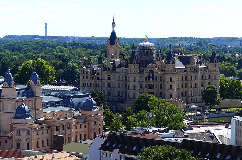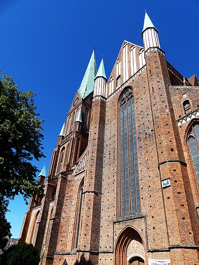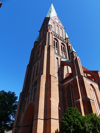 18.08.2025: Vom Vorgängerbau des Doms blieb kaum etwas erhalten, einzig die Paradiespforte, das westliche Südportal im Turm stammt noch aus jener Zeit. Vermutlich blieb es erhalten, da es schon im gotischen Stil ausgeführt war. Auch der einstige Turm stand noch lange Zeit, wurde jedoch später abgerissen und 1889 durch einen neogotischen Turm ersetz. Durch die Schenkung einer Reliquie mit dem angeblichen Blut Christis entwickelte sich Schwerin zu einem der bedeutendsten Wallfahrtsorte Nordostdeutschlands. Die Pilger brachten viel Geld in die Kassen und da man mit dem Aufstieg der Hansestädte Rostock, Stralsund, Greifswald, Wismar mithalten wollte, begann man 1270 damit einen Neubau des Dom im Stil der Gotik zu beginnen. Dieser Neubau lag auf dem höchsten Punkt des Domberges und sollte deutlich prächtiger, als der Vorgängerbau werden. Das Hauptschiff des Neubaus wurde um rund 40 Meter auf 105 Meter verlängert. Zudem erhielt die dreischiffige Basilika einen Umgangschor mit Kapellenkranz. Die Gewölbehöhe beträgt 26,5 Meter. Bereits 1272 wurde am Chor gearbeitet, der 1327 fertig gestellt war. Ebenso fertig gestellt waren das Querhaus mit östlichen Seitenschiffen und das Kapitelhaus, das sich südlich direkt zwischen Chor und Querhaus an den Dom anschloss. Da im neuen Chor nun Gottesdienste abgehalten werden konnten, wurde der Vorgängerbau abgerissen. Bis zum Ende des 14. Jahrhunderts standen dann auch das restliche Querhaus und das Hauptschiff. 1416 wurde die Kirche eingewölbt und erhielt Fenster im Hauptschiff. Die Bemalung des Domes entspricht im weitesten Sinne der ursprünglichen mittelalterlichen Bemalung. Der 1892 fertig gestellte Turm ist mit 117 m der höchste in Mecklenburg-Vorpommern und dient als Aussichtsplattform. Der Kreuzgang der sich nördlich an den Dom anschliesst war für die Domherren gedacht und wurde zwischen 1392 bis 1463 angelegt. Hier lebten und arbeiteten die Domherren, die für den Gottesdienst und weitere liturgische Dienste zu ständig waren. Der Kreuzgang ist nicht mehr komplett original erhalten. Er wurde in der Neogotik verändert. Besonders das Obergeschoss, dass 1484 aufgesetzt worden war, wurde nach einem Brand im 19. Jahrhundert stark verändert: