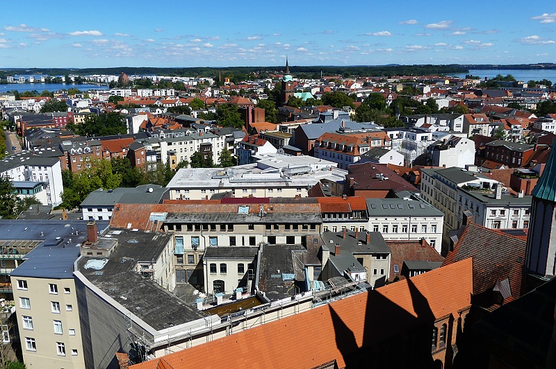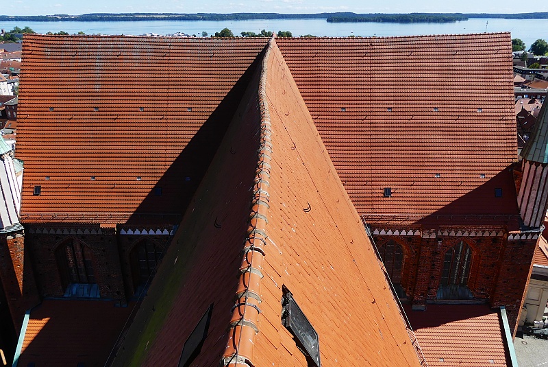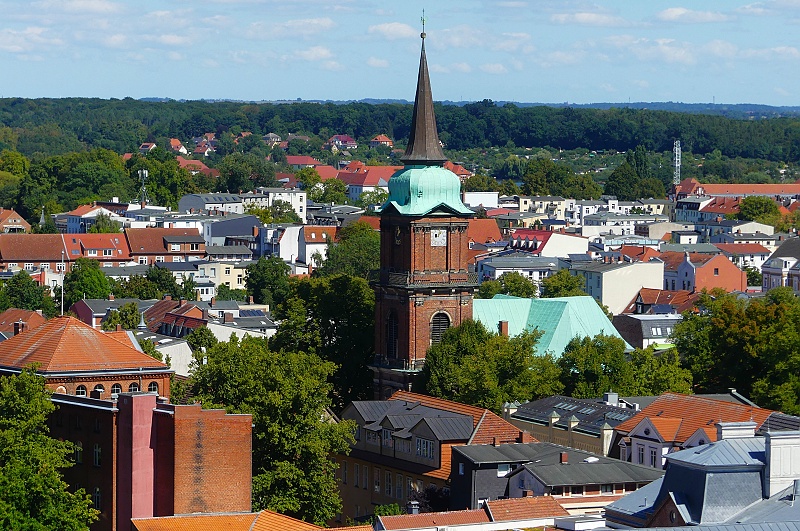 08.08.2025: Vom Domkapitel für die geistigen Bedürfnisse der Bürger der Stadt Güstrow gestiftet, wird die Pfarrkirche St. Marien auf dem Markt 1308 das erste Mal urkundlich erwähnt. Anfang des 16. Jahrhundert wurde sie dreimal durch Stadtbrände zerstört bzw. stark in Mitleidenschaft gezogen, aber immer wieder zusammen mit den Häusern der Stadt aufgebaut. Seit 1533 wurde in der Marienkirche lutherisch gepredigt. 1780 bekam sie den barocken Turmhelm, 1880-1883 wurde sie durch Hofbaurat Daniel grundlegend umgebaut und erhielt die heutige Gestalt als dreischiffige Hallenkirche. Die Bürger Güstrows statteten ihre Kirche im Laufe der Jahrhunderte grosszügig aus. Zu sehen sind eine Pietà (Anfang 1500), eine fünfteilige Triumphkreuzgruppe (1516), der prächtige Wandelaltar (1522) mit dreizehn Schnitzreliefs von Jan Bormann und sechs Tafelgemälden von Bernaert von Orley sowie das Ratsgestühl von 1599 mit Eichenintarsien. Zahlreiche Wandleuchter und zwei flämische Kronen wurden von Handwerkern und Bürgern gestiftet. An den Wänden befinden sich verschiedene Epitaphien, die an Bürgermeister und Bürger der Stadt erinnern. Die Orgel samt Orgelempore wurde 1764 durch den Rostocker Orgelbaumeister Paul Schmidt im barocken Stil in die Kirche hineingebaut: