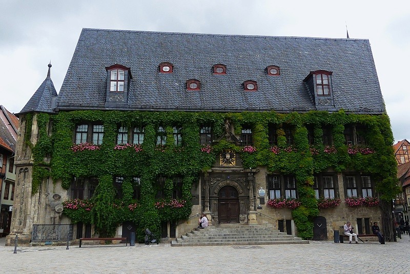 03.08.2025: Im Jahr 1310 wird das Rathaus zum ersten Mal urkundlich erwähnt. Der frühgotische Bau ist bis heute in seinem Kern erhalten geblieben. Für mittelalterliche Verhältnisse ist das einstöckige Steingebäude mit dem hohen Satteldach ein aussergewöhnlich grosser Baukörper – ein Zeichen für die wirtschaftliche Kraft der aufstrebenden Stadt. Die spitzbogigen Fenster wurden im 17. Jahrhundert durch Renaissanceformen ersetzt. Im Zuge dieser Umbauten zwischen 1616 und 1619 wurde auch der ursprünglich an der Nordseite liegende Eingang an die Marktseite verlegt und mit dem prachtvollen Renaissanceportal geschmückt, das von einer Abundantia, einer Göttin des Wohlstandes, bekrönt wird. Über der Tür ist das Quedlinburger Stadtwappen mit einem sitzenden Hund in einem geöffneten Tor angebracht. An der linken Seite wurde 1869 der 2,75 m grosse Roland wieder aufgestellt, der jahrhundertelang auf dem Hof des Ratskellers gelegen hatte. Eine breite Freitreppe führt in eine von Pfeilern getragene Halle. Das steinerne Treppenhaus im Innern ist im Zuge der Rathauserweiterung zwischen 1898 und 1901 entstanden. Zur alten Bausubstanz gehört die hölzerne Säule mit der Christopherusfigur in der Halle. Das farbige Glasfenster am Treppenaufgang zeigt das Stadtwappen und darunter die gekreuzten Kredenzmesser des Freiweltlichen Frauenstiftes. Es ist ebenso wie das Fenster im Stadtverordnetensitzungssaal eine Arbeit der Quedlinburger Glasmalerei Ferdinand Müller aus dem Jahre 1901. Sehenswert sind auch zwei prächtig geschnitzte Türen aus den Jahren 1659 und 1693 im oberen Flur. Der Stadtverordnetensitzungssaal befindet sich im Erweiterungsbau des Rathauses, der zwischen 1898 und 1901 nach Entwürfen des Quedlinburger Stadtbaurats Laumer errichtet wurde: