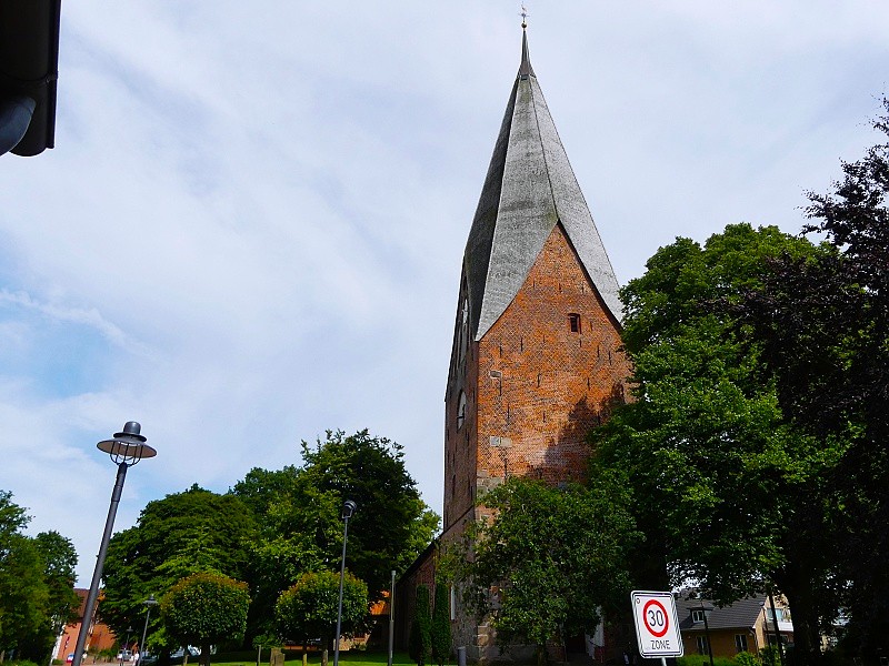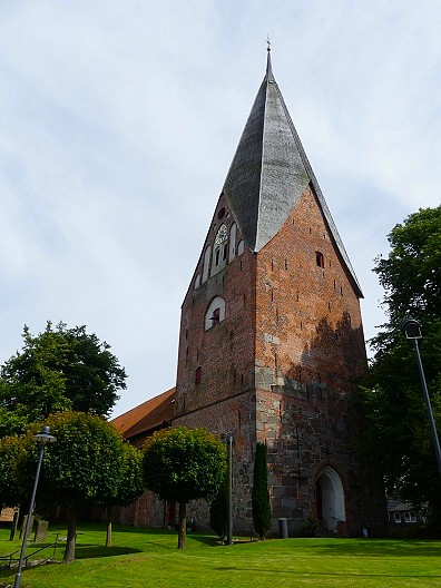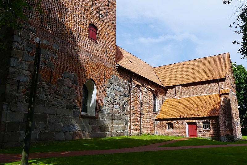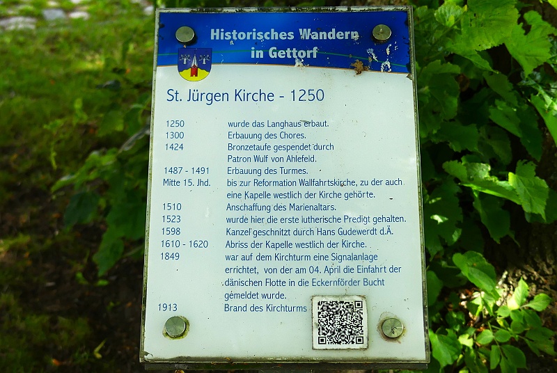 11.07.2025: Die St.-Jürgen-Kirche war bis zur Reformation ursprünglich eine Wallfahrtskirche. 1523 wurde hier die erste lutherische Predigt gehalten. Die mittelalterliche Kirche steht im Ortszentrum und ist gar nicht zu verfehlen. Denn mit ihrem stolzen 64 m hohen Kirchturm überragt sie alles, was in ihrem Umfeld steht. Und gerade dieser Kirchturm hat eine bewegte Vergangenheit. Nicht nur, dass er zweimal beinahe ausgebrannt wäre (1814 und 1913), er spielte auch im Deutsch-Dänischen Krieg eine wichtige Rolle als Beobachtungsposten. Um 1250 wurde an dieser Stelle ursprünglich das Gettorfer Langhaus errichtet, welches heute das Mittelschiff der Kirche bildet. Etwa um 1300 wurde der Chorraum angebaut und etwa 200 Jahre später entstand ein Speicher für Getreide und Landwirtschaftsprodukte. Von diesem Speicher sind heute noch die Reste in Form der Feldsteinwände vorhanden. Der Kirchturm wurde etwa um 1494 fertiggestellt. Er war zunächst mit Bleiplatten bedeckt, die aber im Dreissigjährigen Krieg entwendet wurden und bis heute durch Eichenschindeln ersetzt wurden: