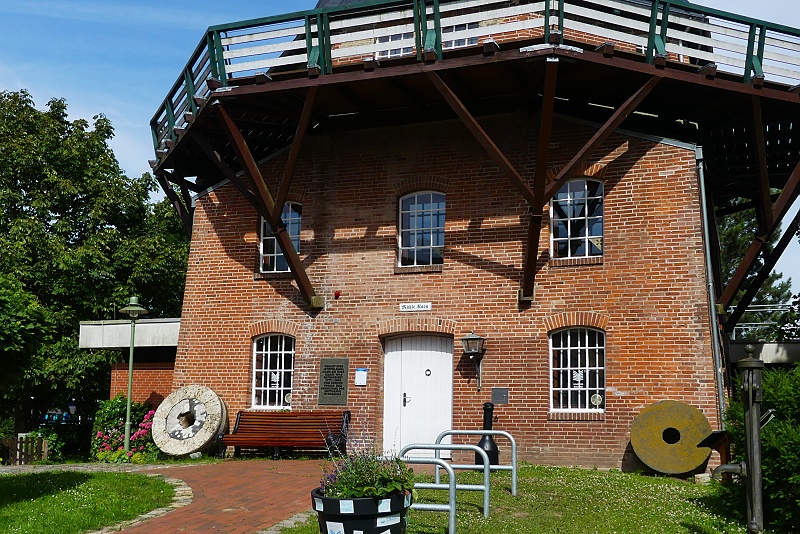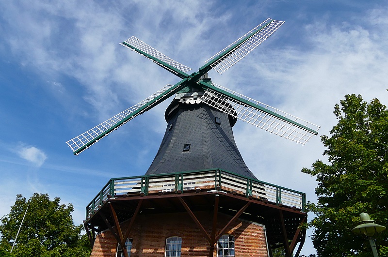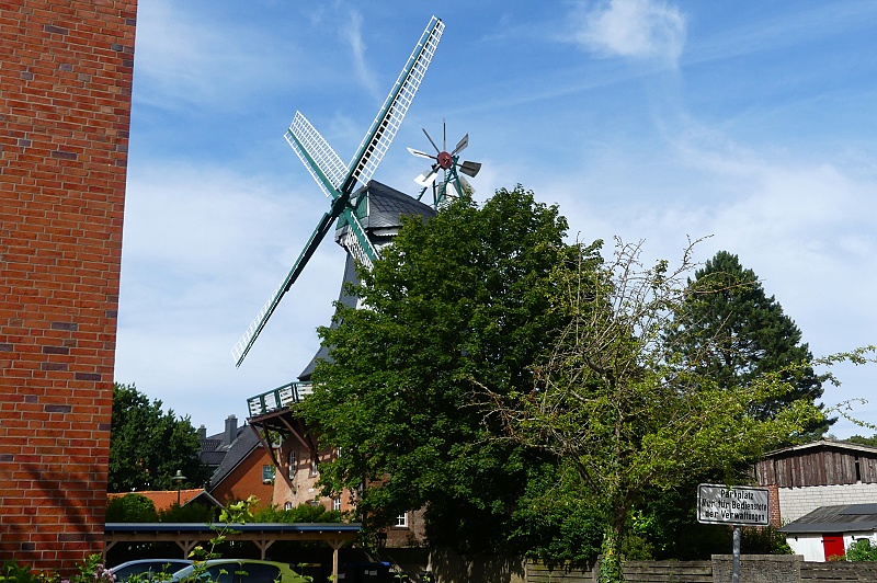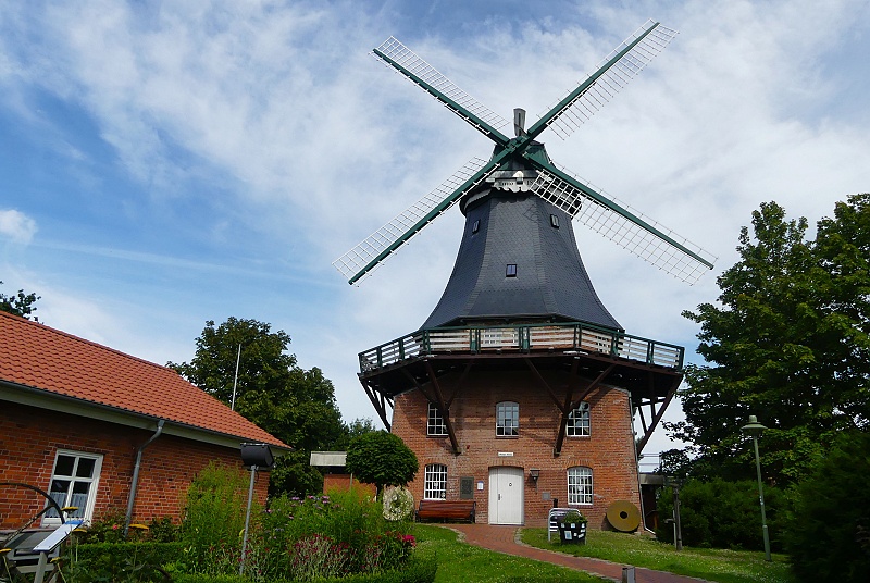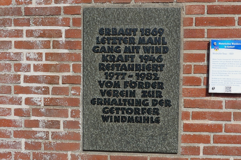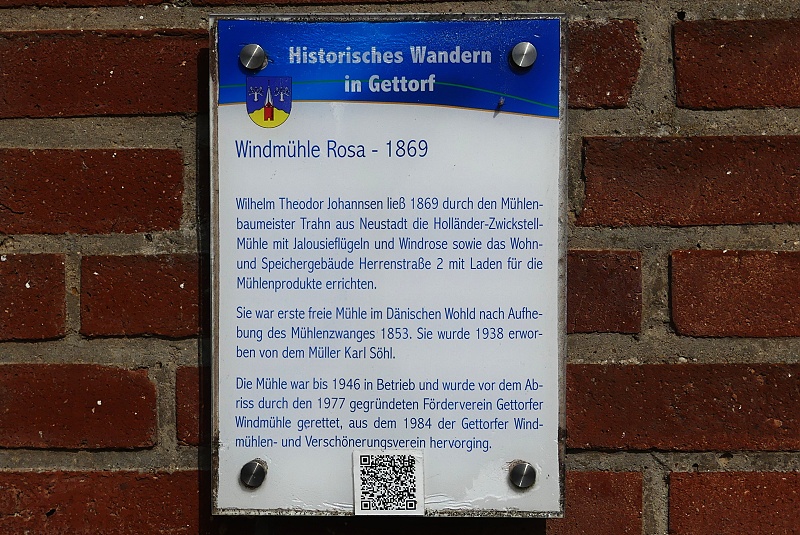 11.07.2025: Die Gettorfer Mühle mit dem Namen Mühle Rosa ist eine alte wunderschöne Windmühle in Gettorf. Sie ist neben der St.-Jürgen-Kirche eines der Wahrzeichen Gettorfs. Es handelt sich um eine Galerieholländermühle, die mit einem zweigeschossigen, aus rotem Backstein errichteten viereckigen Unterbau (Turm), einem schiefergedeckten Dach und Jalousieflügeln sowie einer Windrose genannten Windrichtungsnachführung ausgestattet ist. Ein später angefügter Anbau erweitert die Nutzfläche. Die Mühle liess der Müller Wilhelm Theodor Johannsen 1869 durch den Mühlenbauer Carl Friedrich Trahn (1806–1888) errichten. Bis 1946 wurde die Mühle zum Mahlen von Getreide genutzt. Zwischen 1977 und 1982 wurde die Mühle vom Verein zur Erhaltung der Gettorfer Windmühle renoviert. Heute wird die Gettorfer Windmühle als Gemeindebücherei sowie für Hochzeiten genutzt: