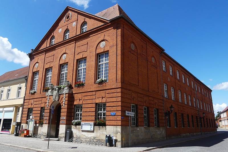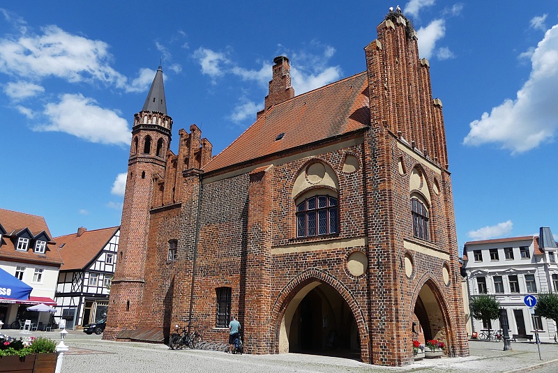 30.07.2025: Das historische Rathaus gehört zu den bekanntesten Profanbauten der norddeutschen Backsteingotik. Es wurde vermutlich vom Stettiner Baumeister Hinrich Brunsberg um 1430 erbaut. Ein Blickfang ist die 24 Meter hohe Schaufassade. Dahinter verbirgt sich der Rathausfestsaal mit seinem prächtigen Sternrippengewölbe und einem Mittelpfeiler, der sich durch alle Ebenen des Rathauses zieht. 1480 kam der westliche Flügel mit der Gerichtslaube, in der heute Trauungen stattfinden, hinzu. Das zweigeschossige Gebäude besass ursprünglich keine Aussentreppe. Seit 1929 beherbergt das Rathaus im Erdgeschoss sowie in den Kellergewölben das älteste Museum Tangermündes:
