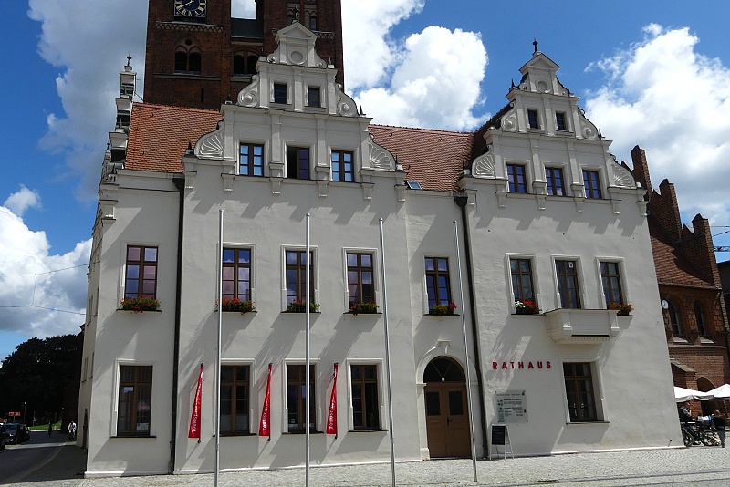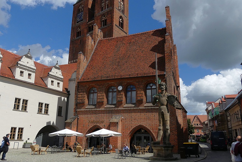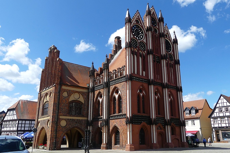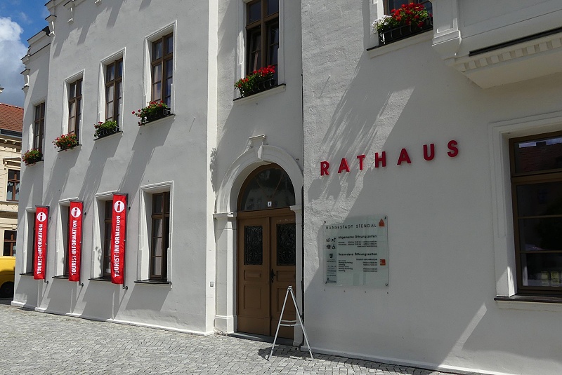 29.07.2025: Das Rathaus in Stendal ist ein Backsteinbau aus mehreren, zu verschiedenen Zeiten entstandenen Trakten. Aus dem 14. Jahrhundert stammt die rote unverputzte Gerichtslaube, die sich in spätgotischen Bögen hin zum Markt öffnet. In ihr tagte einst das Marktgericht. Jüngste dendrochronologische Untersuchungen des Dachstuhls lassen eine Rückdatierung der Gebäudekonstruktion auf ca. 1350 zu. An die Gerichtslaube stösst das in der Mitte bis Ende des 15. Jahrhunderts errichtete Gewandhaus an, mit dem heutigen Ratskeller. Der Ratskeller besitzt einen hallenartigen Hauptraum, der aus zwei Schiffen mit Kreuzrippengewölben besteht. Ursprünglich war dieser Raum die Kaufhalle der Gewandschneidergilde, wo Ballen und Tuche gehandelt wurden. Ein ganz besonderes Schmuckstück ist die Schnitzwand von 1462 in der alten Ratsstube im Obergeschoss des Gewandhauses. Sie ist Teil einer ehemaligen Gesamtvertäfelung des Raumes und die älteste erhaltene profane Schnitzwand Deutschlands, älter als die berühmten Holzvertäfelungen in den Rathäusern zu München (1481) und zu Goslar (um 1500). Auf der gesamten Vertäfelung waren einst der Kaiser und die sieben Kurfürsten des Reiches abgebildet. Ende des 15. Jahrhunderts kam der rechtwinklig zu Gerichtslaube und Gewandhaus stehende und der Achse der Marienkirche folgende Corpsflügel, der Hauptflügel, hinzu. Er wurde im 16. Jahrhundert verändert und sieht heute wie ein Renaissancegebäude aus – weiss verputzt mit Schweif- und Zwerchgiebeln. Im 19. Jahrhundert setzte man links daneben noch einen weiten Baukörper im Stil der Renaissance. Im Inneren des Corpsflügels sind heute noch die gotischen Gewölbe zu sehen und im Amtszimmer des Bürgermeisters, dem Kagelwitzzimmer, findet sich ein Sterngewölbe mit hölzernem Schlussstein. Seit 1525 steht vor dem Stendaler Rathaus die Kolossalfigur des Rolands, ein Zeichen der Rechte und Freiheiten der mittelalterlichen Stadt. Diese Sandsteinfigur hat die beachtliche Gesamthöhe von 7,80 m. Einst war Stendal einer der grössten norddeutschen Handelsplätze. Es gab Verbindungen nach Hamburg, Lübeck und Flandern, aber auch nach Augsburg und Nürnberg und bis nach Tirol. Sowohl den prächtig ausgestatteten Kirchen als auch dem Rathaus sieht man noch heute an, welch Reichtum diese Handelsbeziehungen mit sich brachten: