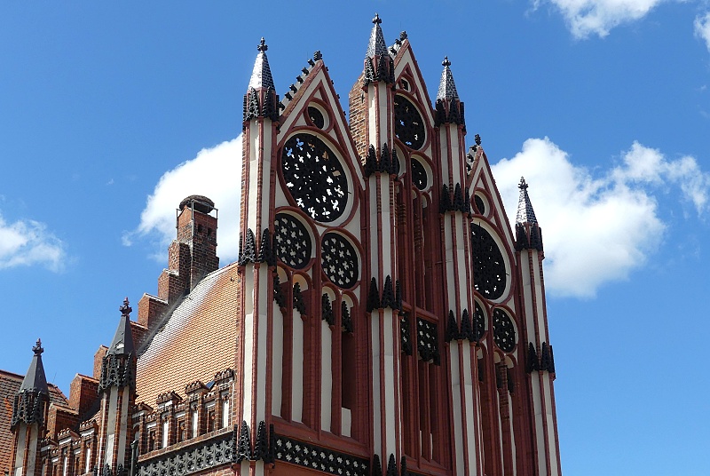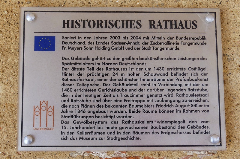 30.07.2025: Das historische Rathaus gehört zu den bekanntesten Profanbauten der norddeutschen Backsteingotik. Es wurde vermutlich vom Stettiner Baumeister Hinrich Brunsberg um 1430 erbaut. Ein Blickfang ist die 24 Meter hohe Schaufassade. Dahinter verbirgt sich der Rathausfestsaal mit seinem prächtigen Sternrippengewölbe und einem Mittelpfeiler, der sich durch alle Ebenen des Rathauses zieht. 1480 kam der westliche Flügel mit der Gerichtslaube, in der heute Trauungen stattfinden, hinzu. Das zweigeschossige Gebäude besass ursprünglich keine Aussentreppe. Seit 1929 beherbergt das Rathaus im Erdgeschoss sowie in den Kellergewölben das älteste Museum Tangermündes: