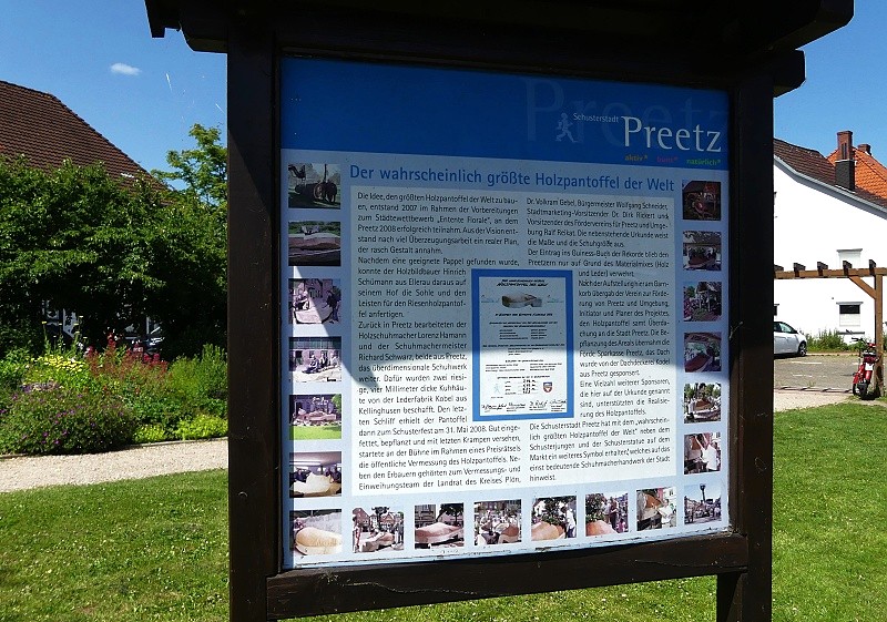 20.06.2025: Dieses Projekt greift das alte Schuhmacherhandwerk in Preetz auf, das die Stadt als Schusterstadt weit über die Grenzen des Landes hinaus bekannt machte. Noch 1850 arbeiteten in Preetz 160 selbständige Schuhmachermeister mit vielen Gesellen. Die ausgezeichnete Handwerksarbeit führte dazu, dass die Holzschuhe, bekannt als Preetzer Holzschuhe, den Namen der Stadt weit über die Grenzen hinaustrugen. 2007 beteiligte sich die Stadt Preetz an dem Wettbewerb „entente florale“. Ralf Reikat schlug vor, als sichtbare Verbeugung vor dem Schusterhandwerk den grössten Holzpantoffel der Welt zu bauen. Geeignet für die Herstellung traditioneller Holzschuhe sind Weichhölzer, beispielsweise Pappelholz. Doch anders als die traditionellen Holzschuhe, die aus einem einzigen Holzblock gefertigt werden, wird der Preetzer Holzschuh aus Holz und Leder hergestellt. So sollte auch der Riesenpantoffel aussehen. Doch woher bekommt man die Lauffläche für einen derart riesigen Holzpantoffel? Es traf sich gut, dass die Stadt Preetz eine umsturzgefährdete Pappel fällen musste und den Stamm für dieses Projekt kostenlos zur Verfügung stellte. Der Holzbildhauer Hinrich Schümann aus Ellerau bei Pinneberg formte aus dem dicken Holzstamm die Sohle und den Leisten. Der Holzschuhmacher Lorenz Hamann aus Preetz spendete dazu zwei Kuhfelle und bearbeitete diese gemeinsam mit dem Schuhmachermeister Richard Schwarz. Den letzten Schliff erhielt der Holzpantoffel anlässlich des Schusterfestes 2008, als er mit einem kleinen Kran an den endgültigen Standort verbracht wurde. Der Eintrag in das Guinessbuch der Rekorde wurde leider vereitelt, weil der Schuh zwei unterschiedliche Materialien, also Holz und Leder, aufwies. Darum heißt er heute „Der wahrscheinlich größte Holzpantoffel der Welt“. Die Unterkunft, also das Holzgestell mit Reetdach, stiftete der Dachdecker Bernd Kodel, die farbenfrohe Blumenumrandung wurde von der Förde Sparkasse gespendet und die Einfassung stiftete der Metallbauer Thoralf Volkens. Nach der öffentlichen Vermessung hat der Förderverein Preetz und Umgebung e.V den Pantoffel der Stadt Preetz geschenkt:
