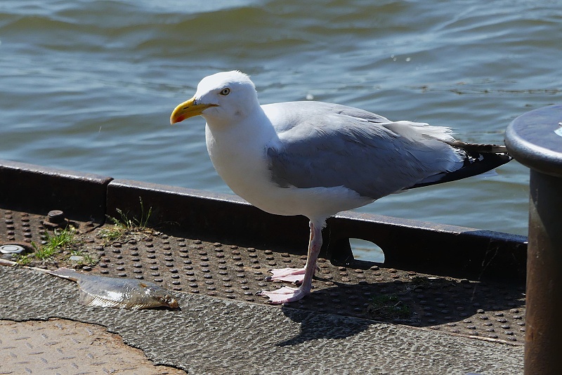 19.08.2020: Dieses kleine „Model“ auf einem Poller an den Landungsbrücken in St. Pauli ist meines Erachtens eine Silbermöwe (Larus argentatus) aus der Gattung Larus: