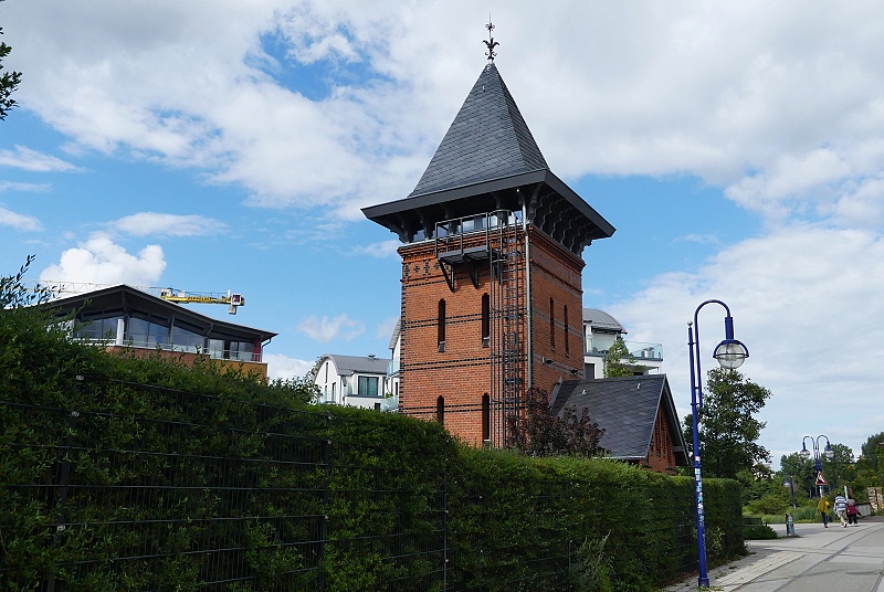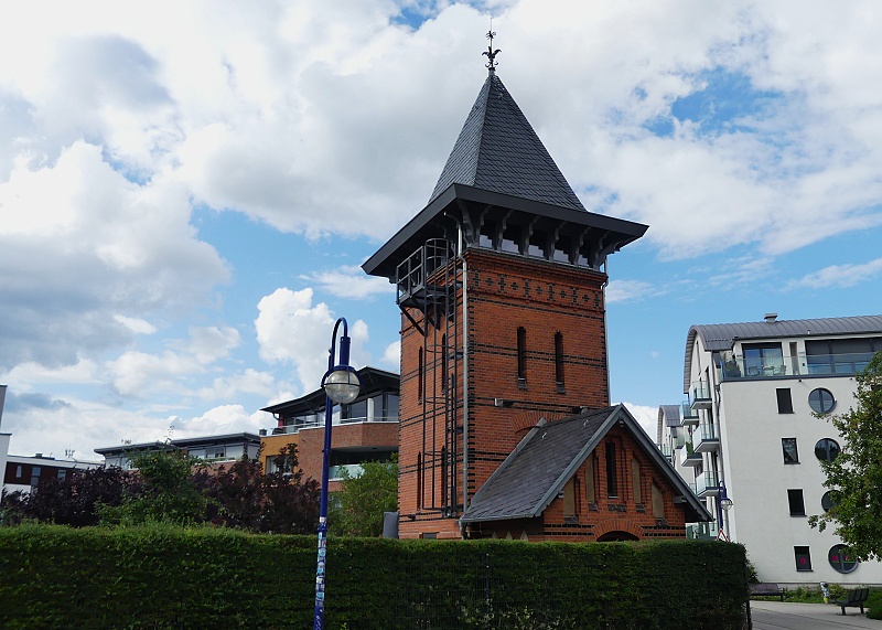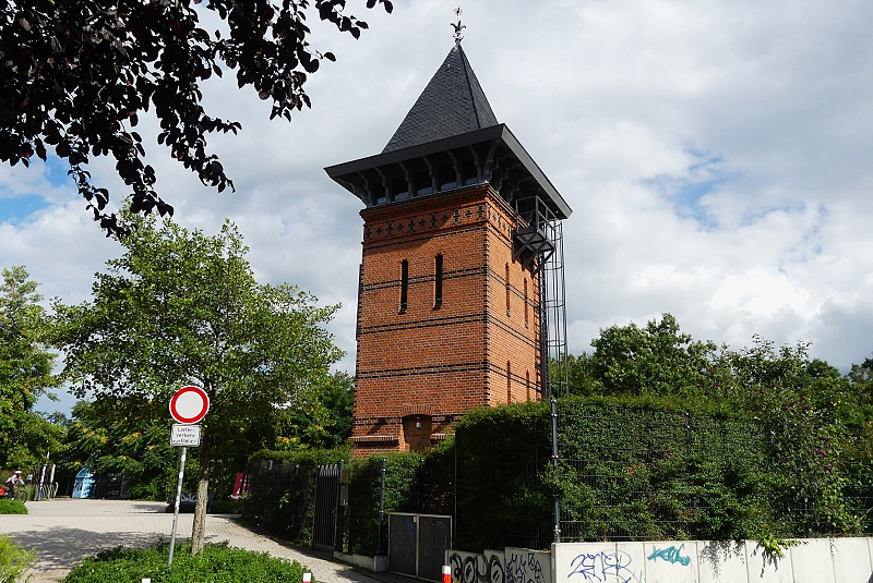29.07.2025: Der Turm entstand in den 1890er Jahren in gotissierendem Stil aus gelblichem Klinkermauerwerk mit dunklen gleichfalls aus Klinkern bestehenden Bändern. Bekrönt wird der dreigeschossige Turm von einem weit auskragenden, pyramidenförmigen Spitzhelm. An den Seiten befinden sich Schlitzfenster. An der südlichen Seite ist ein kleines Bedienhäuschen vorgelagert. Das Bauwerk gehörte zum hydraulischen Antrieb der wenige Meter weiter östlich die Elbe überspannenden Hubbrücke Magdeburg. Das Mittelfeld dieser Eisenbahnbrücke war beweglich und wurde bei höheren Wasserständen zeitweise hochgezogen. Das für den hierfür bestehenden hydraulischen Antrieb erforderliche Wasser wurde in diesem Druckwasserakkumulator mit etwa 50 bis 70 at bereitgehalten. Der Wasserturm stellt ein Zeugnis der für die Zeit von 1880 bis 1900 typischen Antriebsform dar und ist einer der nur selten erhaltenen Funktionsbauten dieser frühen Antriebstechnik. Städtebaulich ist der Turm im Zusammenhang mit der 1934 umgebauten Brücke und den in Teilen noch erhaltenen Bahnhofsanlagen von besonderer Bedeutung: