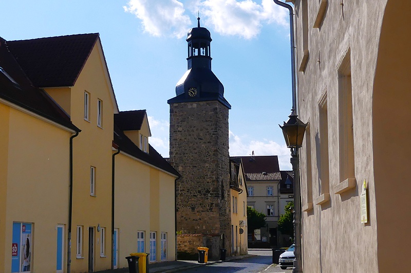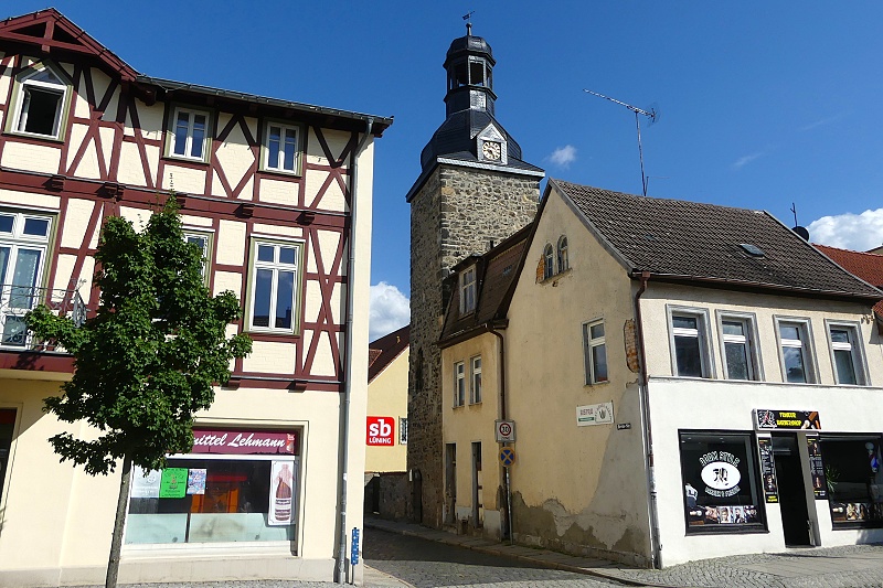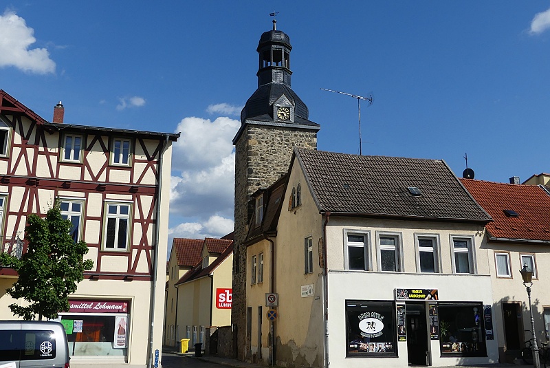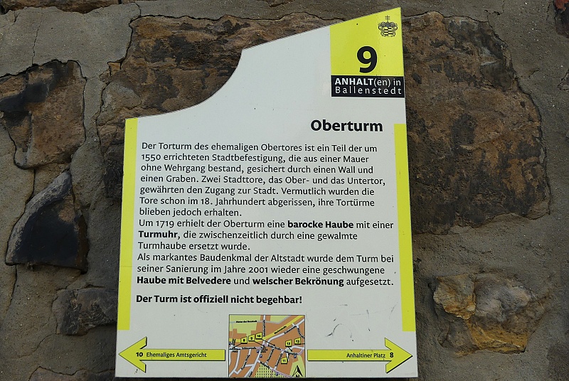 04.08.2025: Der Torturm befindet sich am westlichen Ende der Breiten Strasse in Ballenstedt nahe der Mündung in den Breitscheidplatz. Da Ballenstedt erst im 16. Jahrhundert zur Stadt erhoben wurde, erhielt es auch erst in der Mitte des Jahrhunderts eine eigene Stadtbefestigung. Im Fall des Obertores kann diese gut datiert werden, da angenommen wird, dass die Verleihung der Stadtrechte um 1544 erfolgte. Zudem ist das Fenster an der Nordseite gotisch gestaltet, so dass der Turm noch in die Spätgotik gehören dürfte. Während sich das Tor selbst nicht erhalten hat und wohl im 18. Jahrhundert abgerissen wurde, steht der Torturm bis heute an der historischen Stelle. Der quadratische Bruchsteinturm besitzt einen Turmhelm aus den Jahren 1718/1719 mit Turmuhr, Belvedere und Welscher Haube. Er wurde letztmals im Jahr 2001 saniert, wobei auch die barocke Haube wieder erstand, die zeitweise durch eine gewalmte Haube ersetzt gewesen war. Diese 1972 geschaffene Haube bestand aus Asbestziegeln und musste daher beseitigt werden: